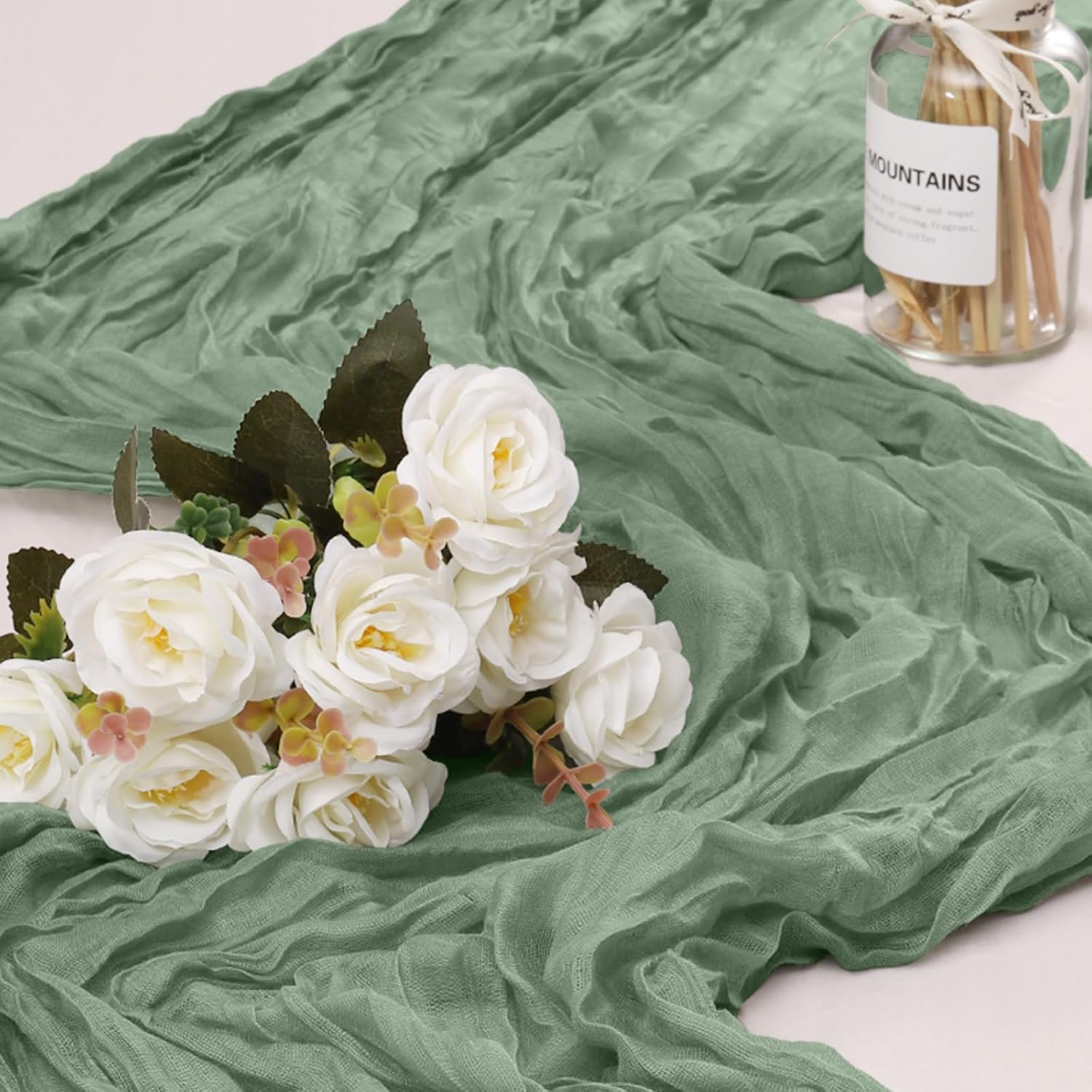 - 【Soft Material】: Made of high quality polyester, soft to touch, comfortable and durable. Wrinkled design cheese cloth farbic, delicate edges and stitches, adopts seamless technique makes this sheer table runner more graceful than traditional fabrics. Our cheesecloth wedding table runners are durable, the colour stays for a long time, does not fade and can be reused.