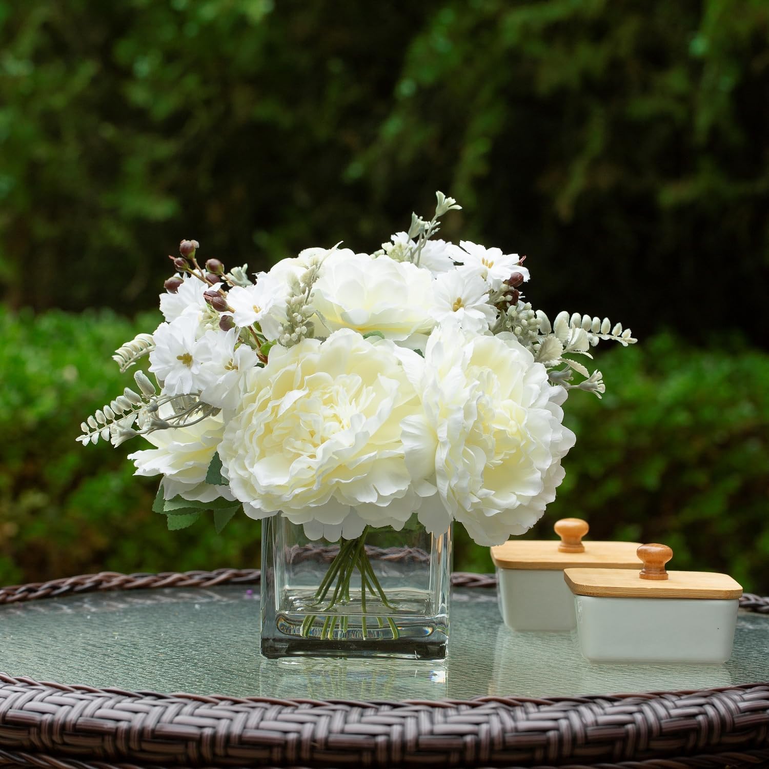 - 【Unique Designs】Each bouquet arrangement is handcrafted. The faux Peony is made of high-grade silk, the fake flower stem is wrapped in plastic wire, the clear glass block vase is crafted with thick glass and a stable bottom to ensure durability, and the acrylic faux water can firmly combine the fake flowers and the clear glass vase. The realistic foliage, soft stems, and handcrafted blooms give an everlasting refreshing look and feel to your floral arrangements.