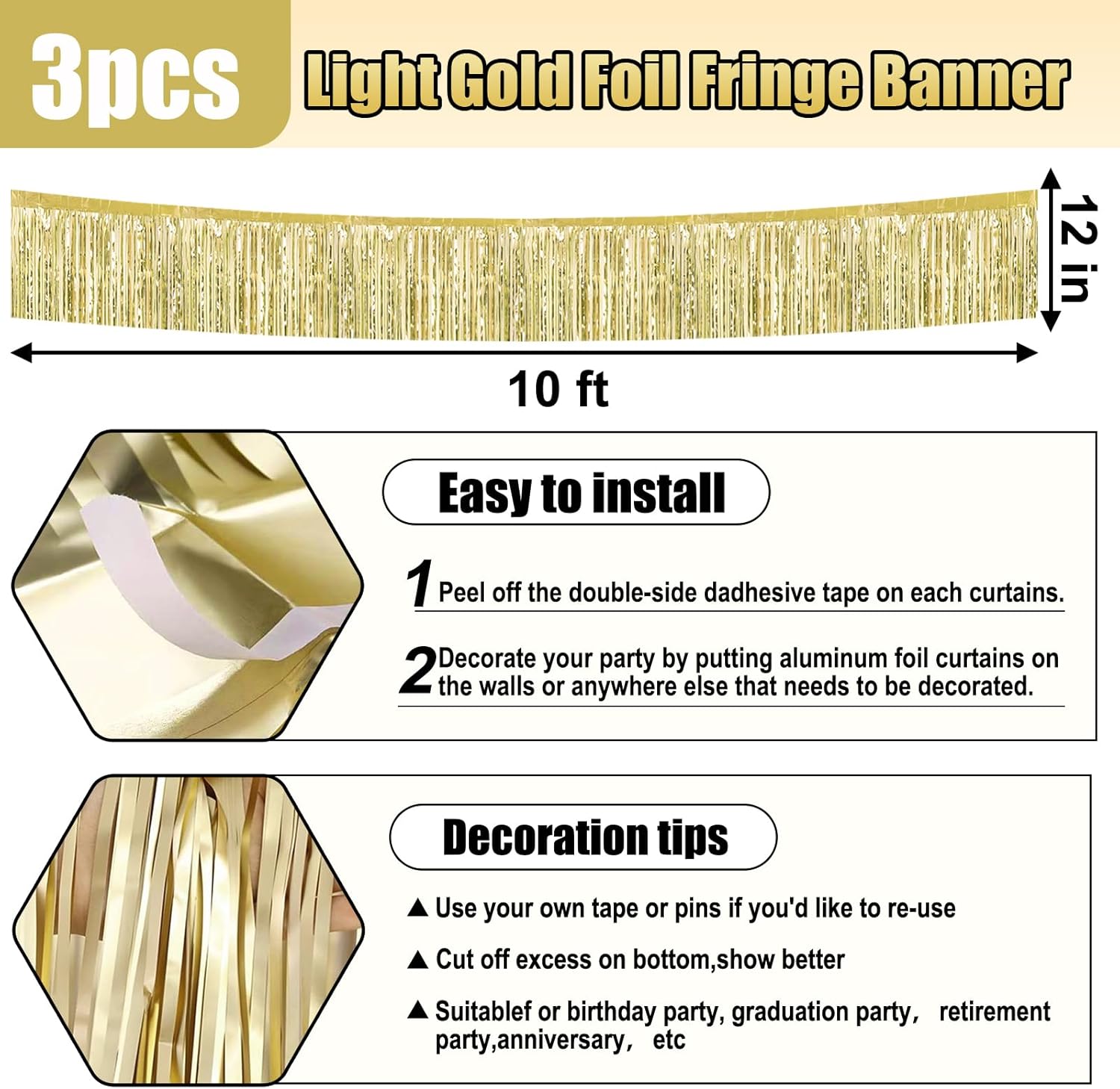 3 Pack 10 Long Light Gold Metallic Foil Fringe Garland Wall Hanging Tassle Banner, Mother's Day, Easter, Parade Floats, Birthday, Theme Party, Wedding Party Decorations