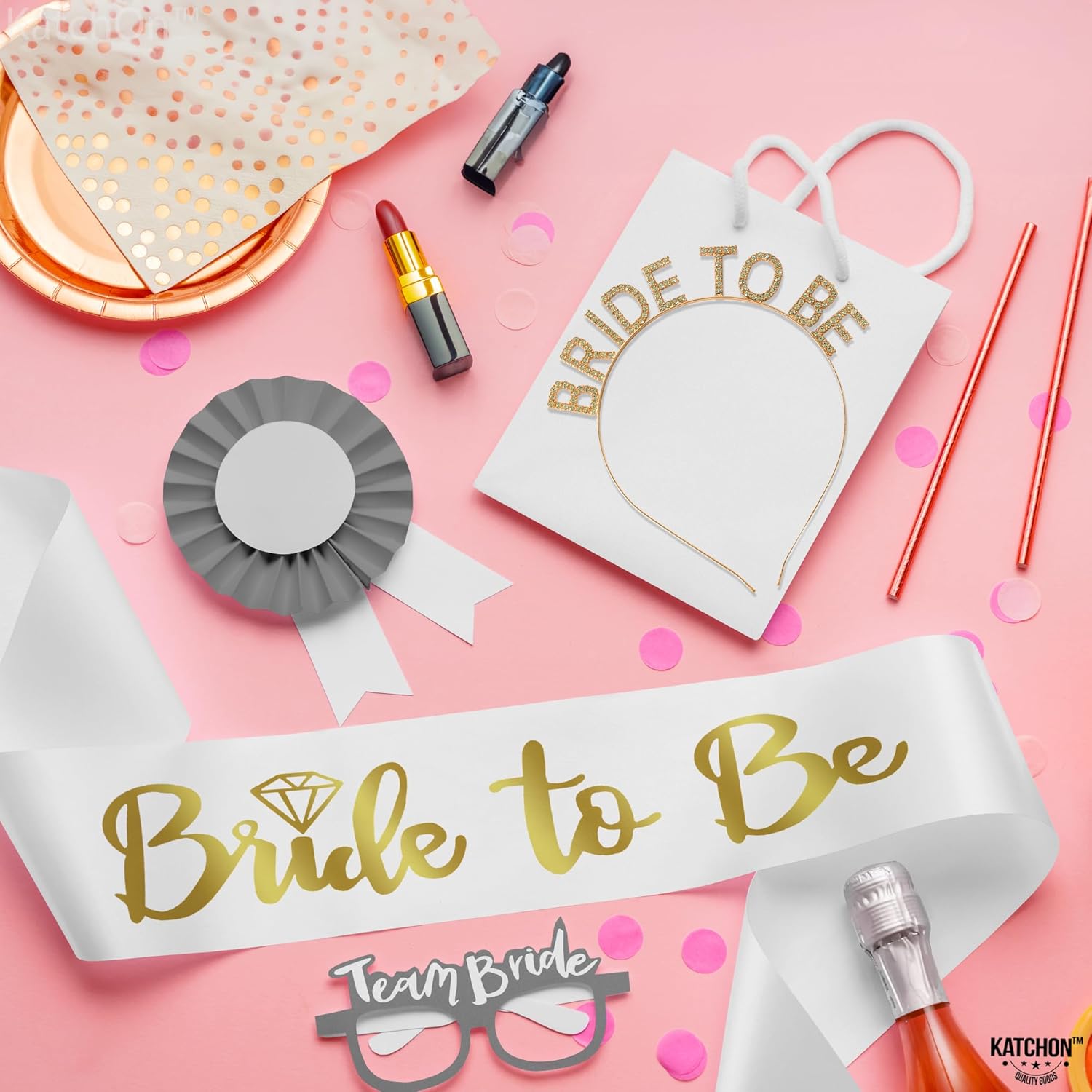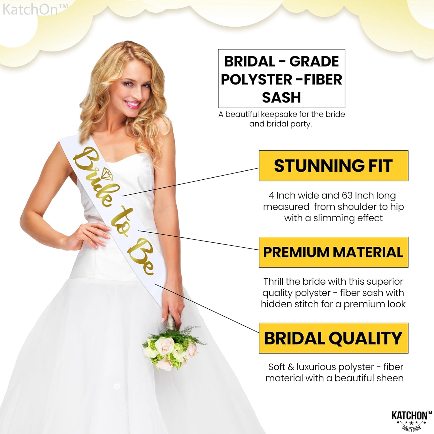 - TRANSFORM YOUR GOWN WITH A CHIC AND FASHIONABLE BRIDE SASH: Our Bride to be sash and crown is NOT just a piece of ribbon, its Crafted with meticulous attention to detail. This White + Gold sash was made with premium quality white satin material and shiny gold print that reads "Bride to Be" with a size of 4 Inches wide and 63 Inches long. Unlike other poorly made sashes, this sash does not tear or wrinkle easily. Durable and reusable, No need to worry about letters peeling off.