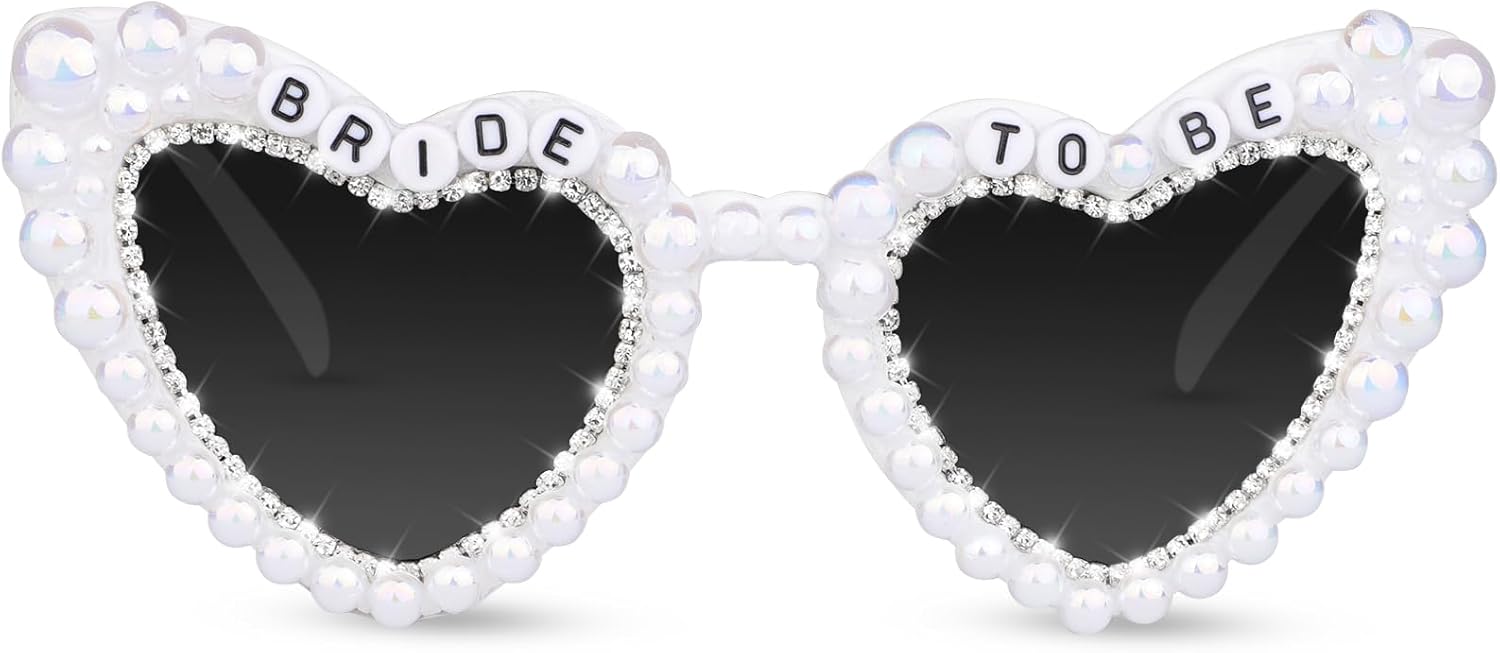 - ELEGANT BRIDE THEME DESIGN: These white heart sunglasses bachelorette party are adorned with dazzling rhinestone and "BRIDE TO BE" lettering, symbolizing timeless love and happiness. Once you put them on, you'll instantly become the center of attention at bachelorette and bride to be parties. Radiate elegance with these bride sunglasses!
