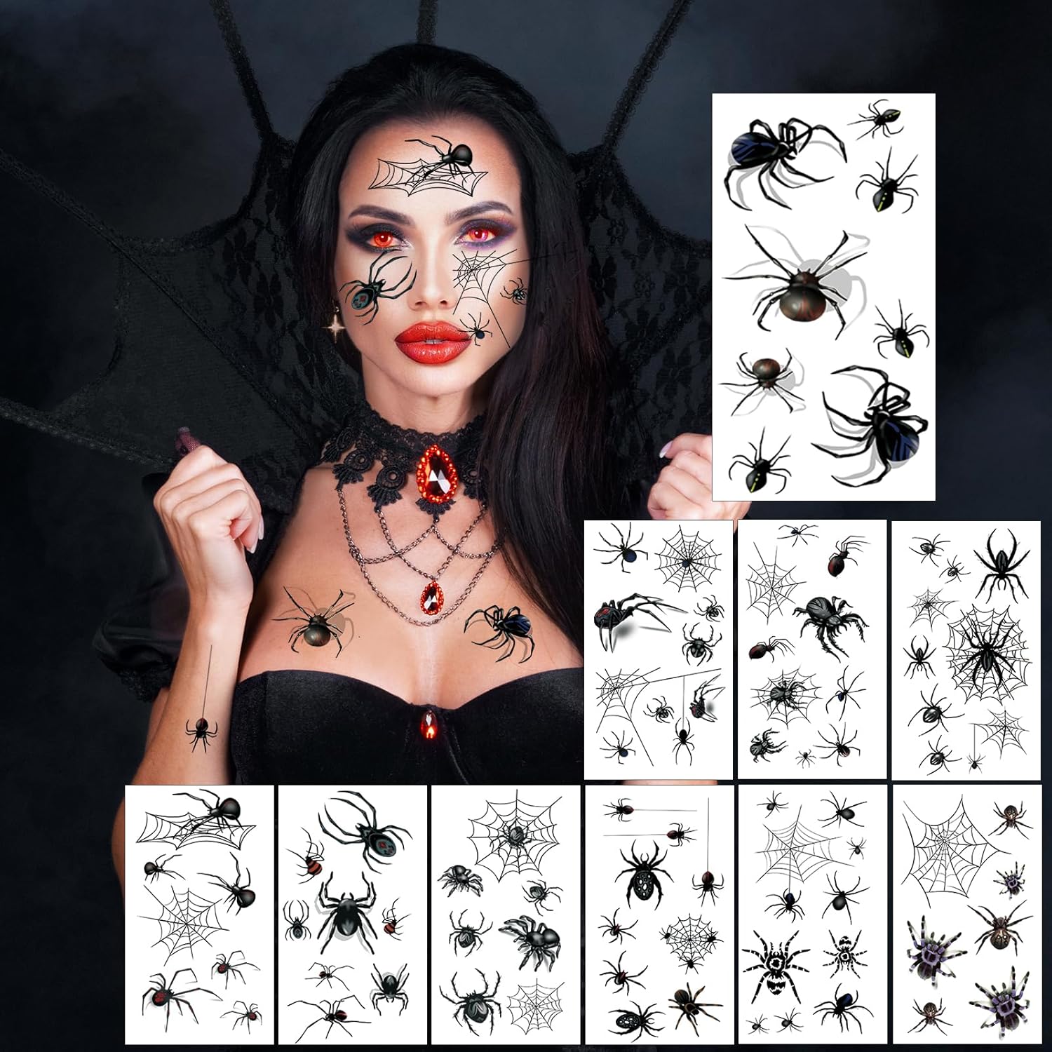 - 【MORE QUANTITY】10 sheets 80+ PCS Halloween spider web temporary tattoos for for kids men women. Much quantity Halloween makeup kit are enough for you share it with your family and friends.
