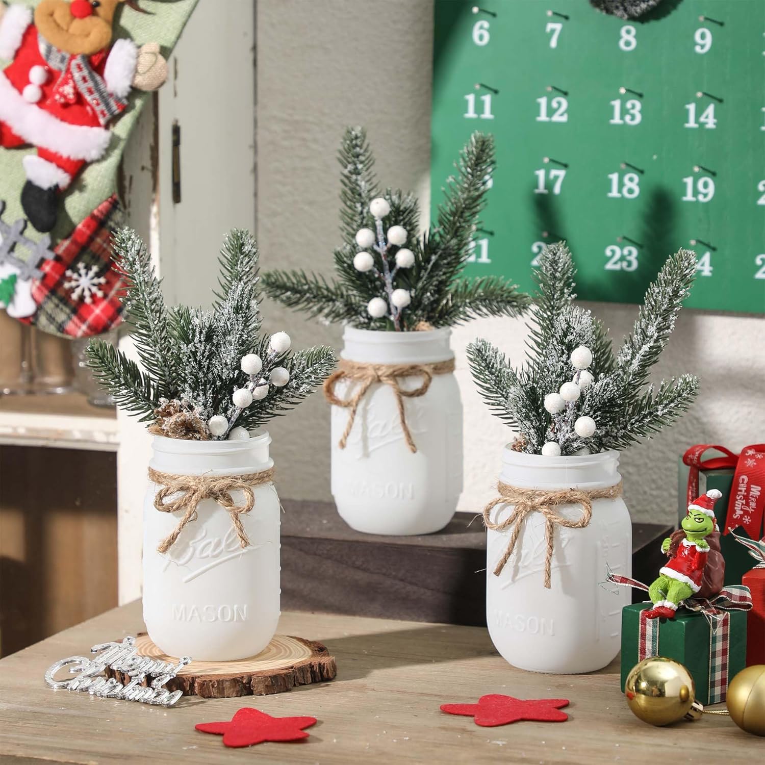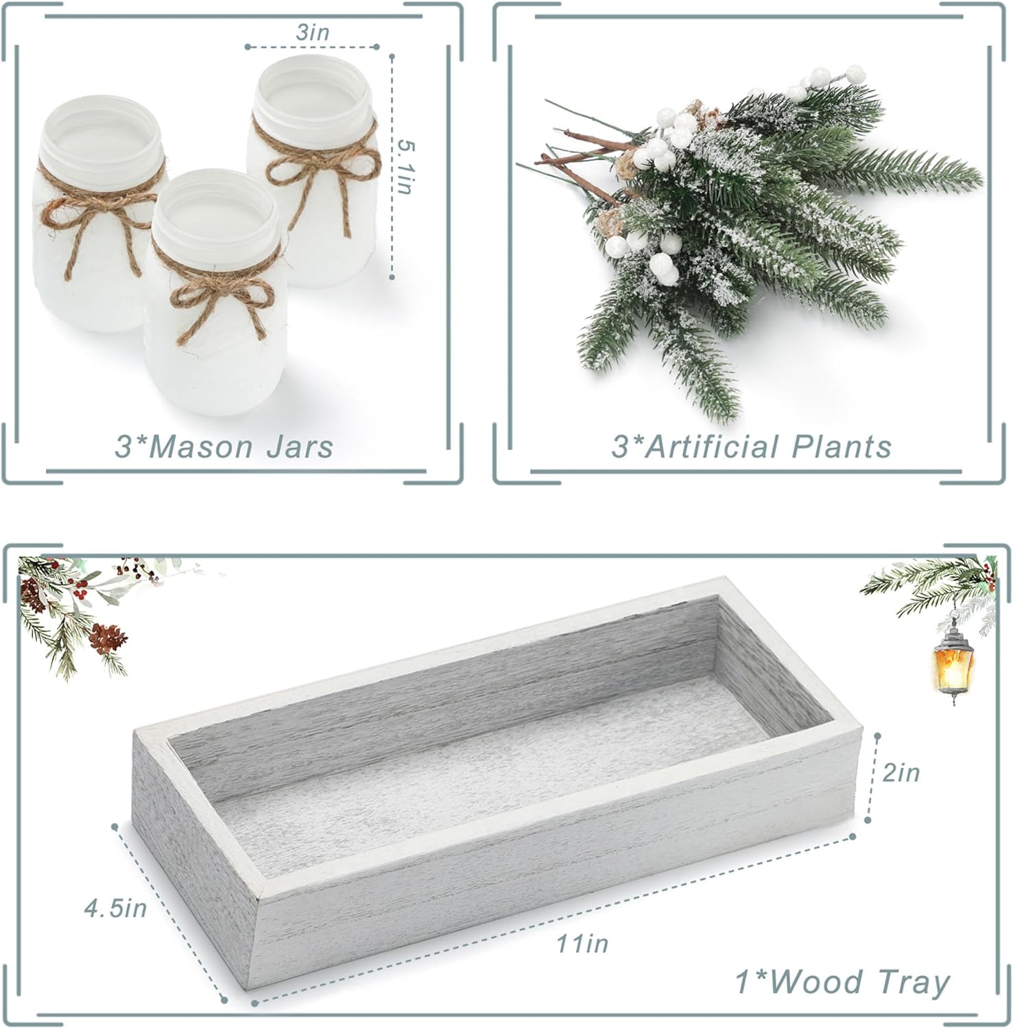 - 【Winter Decorative Mason Jar Set】Set includes 3 Winter decorative mason jars, 3 beautiful artificial plants and 1 rustic wooden tray. Multiple colors of Christmas Mason jars can give you more decorating inspiration, and multiple sets of Mason jars can be combined together to give you more flexibility to match your farmhouse Christmas decor.