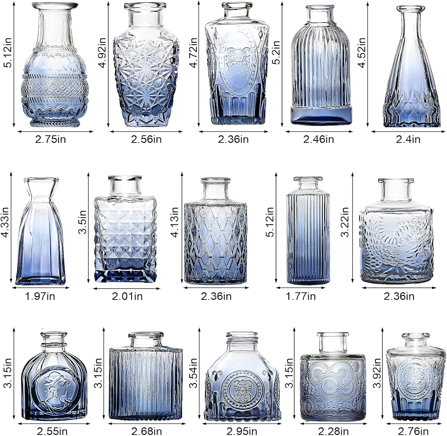 - Vintage Gradient Blue: The 32 glass vases have different styles and shapes, each with delicate patterns. The surface of the small vase is smooth and not rough. Bottles are free of impurities. The spray colour is a premium gradient blue, vintage and advanced. Each blue flower vase holds at least three regular sized flowers. Note: Due to different monitors and lighting, the actual colour may be slightly different