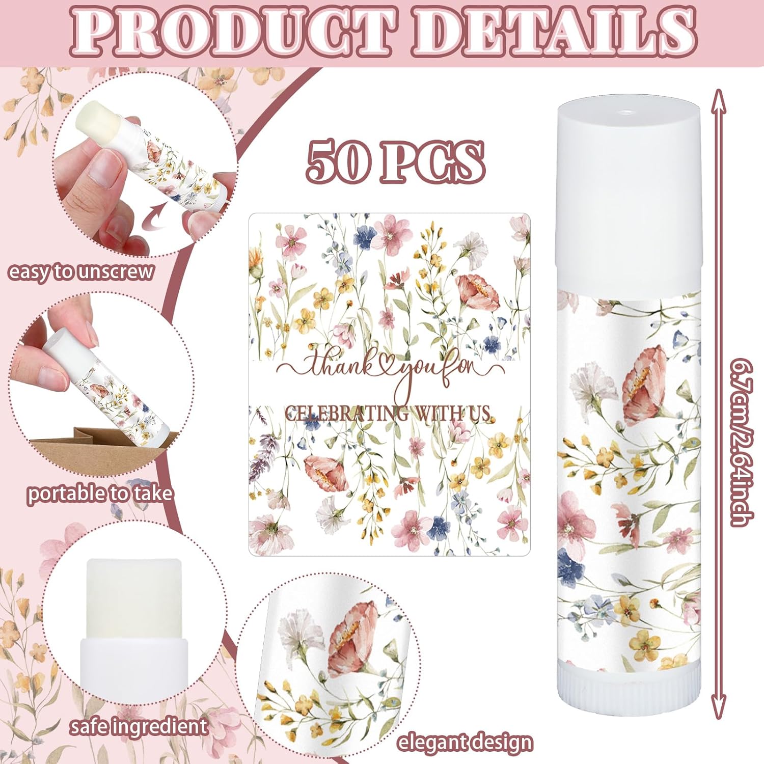 - Lip Balm Favors: you will get 50 pieces of wedding lip balms printed beautiful floral and thankful phrases, cute small wedding souvenirs which smell good and guests will enjoy them