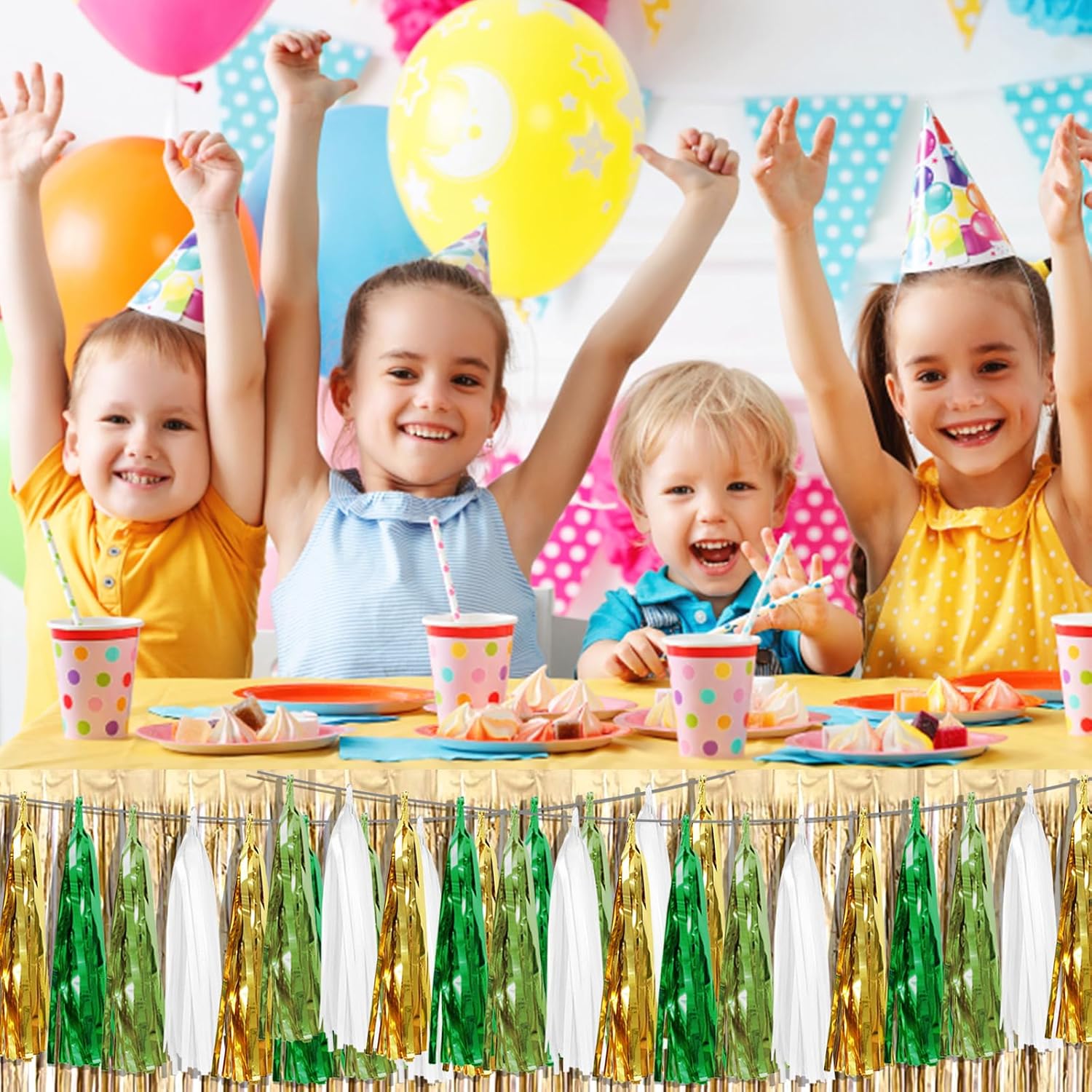 - 【Light Green White Gold Green Party Supplies Set】: The total length of the Light Green White Gold Green birthday tassels banner is 78.7 feet 120tassels, divided into 8 strips, each 9.8 feet long. Each banner contains 15 tassels, and each tassel measures 14 inches, for birthday decorations many occasions, and so on