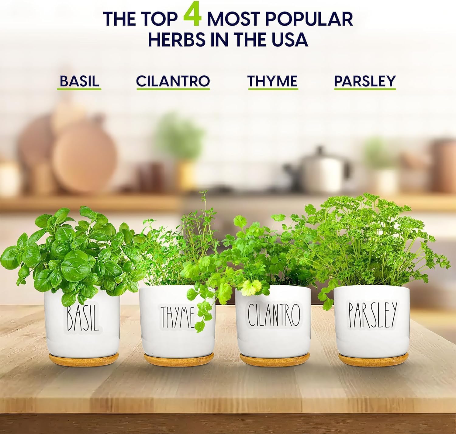 - Equipment & Accessories - This kit includes everything with nothing else to buy. You get 8 pots, 8 saucers to collect runoff, 8 expanding soil discs, and 1 kelp nutrition pack. We also include 8 transparent herb labels so you always know which pot holds which plant. Labels are printed in charming large Rae Dunn font to take the place of the usual stakes. These will look cute in your kitchen.