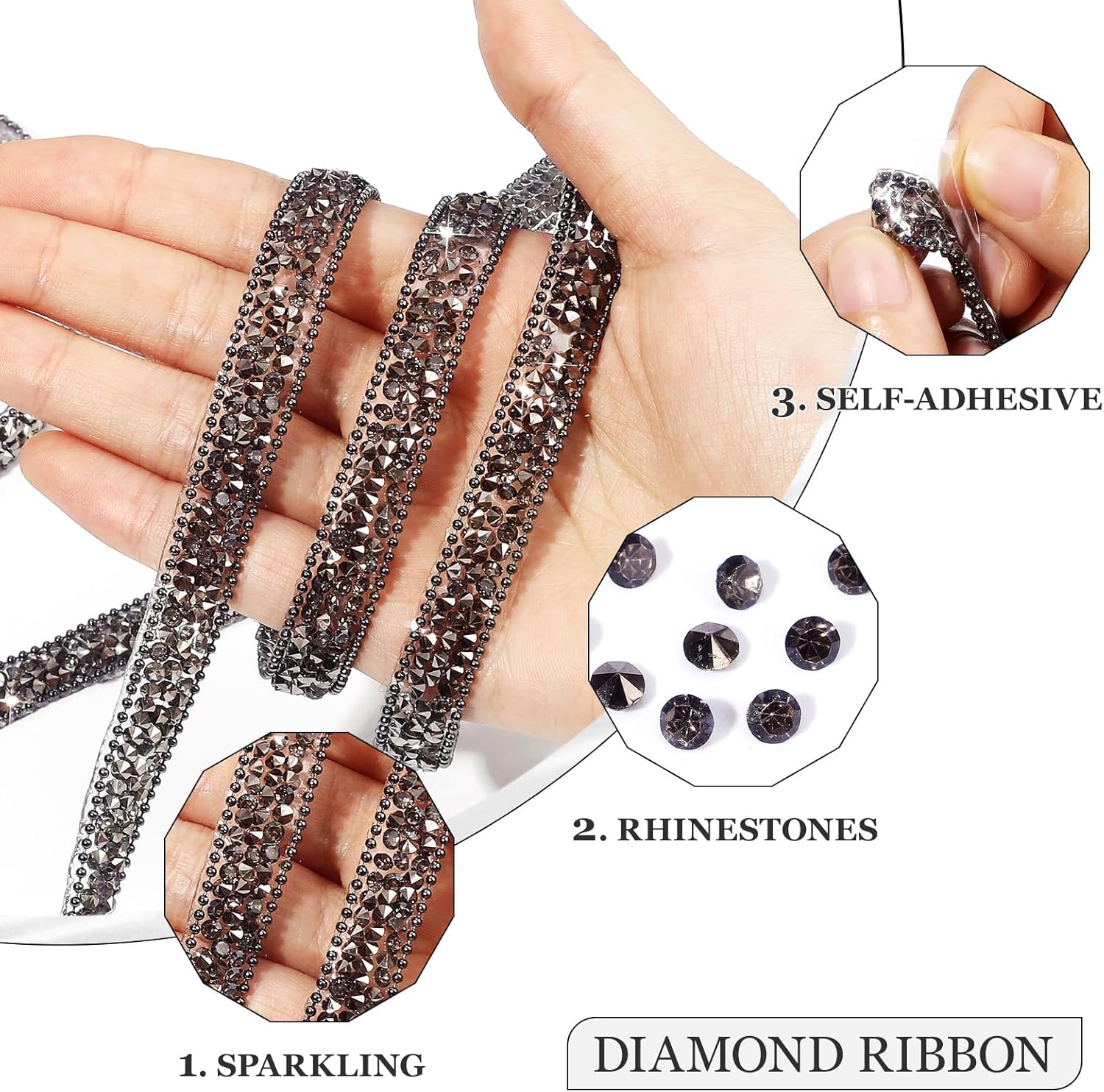 - Self-Adhesive Diamond Ribbon: The self-adhesive design with backing glue makes it possible to stick anywhere as long as the surface is smooth and clean. You cut the rhinestone ribbon into different lengths with scissors, then peel off the back paper of the sticker and paste it on the project you want to decorate.