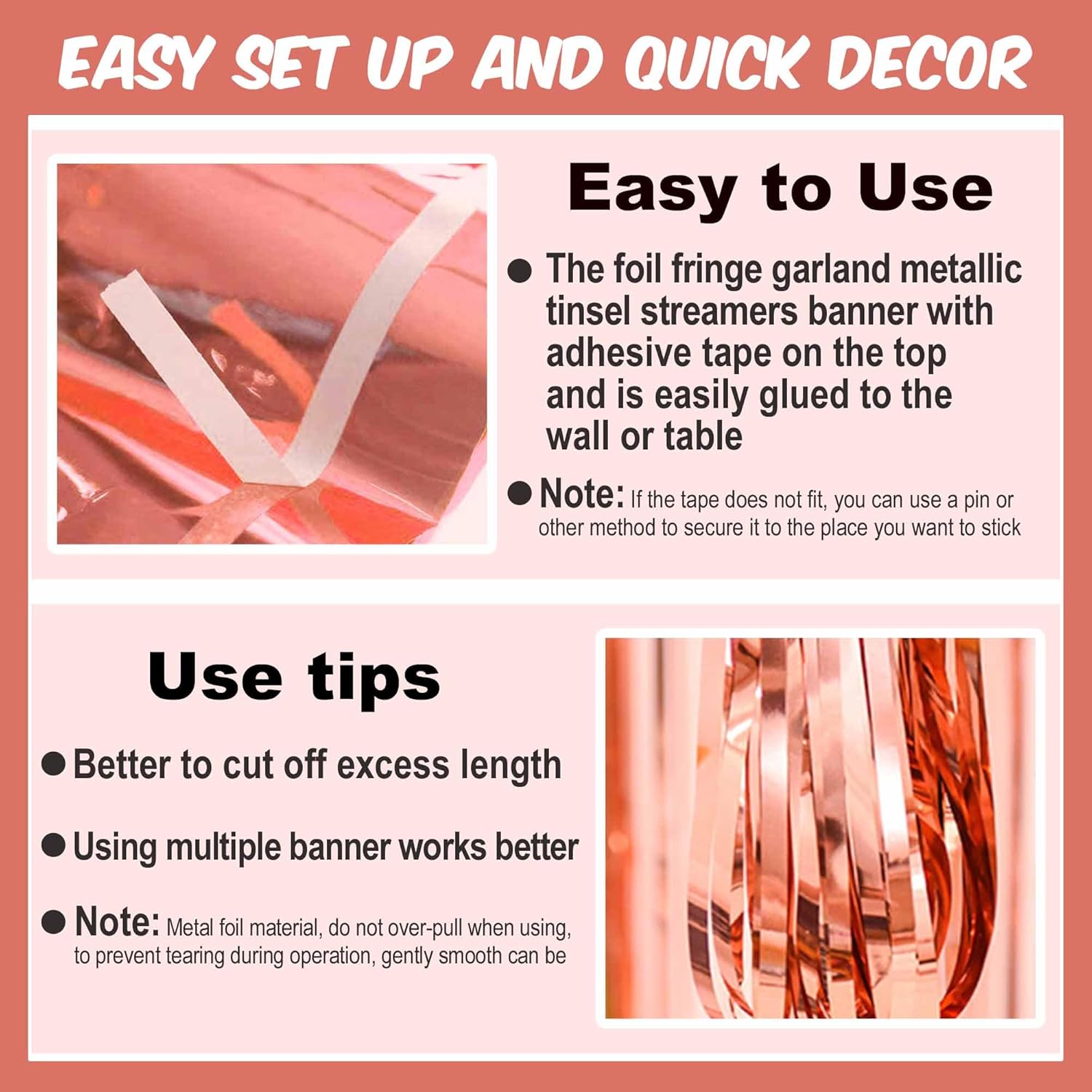 - Easy to Use: Tinsel foil fringe garland banner streamers the back has double-sided tape, gently peel double-sided tape off and it would be very easy to paste on wall, window, table, door, parade float or anywhere you want to decorate, add some festive atmosphere to the party