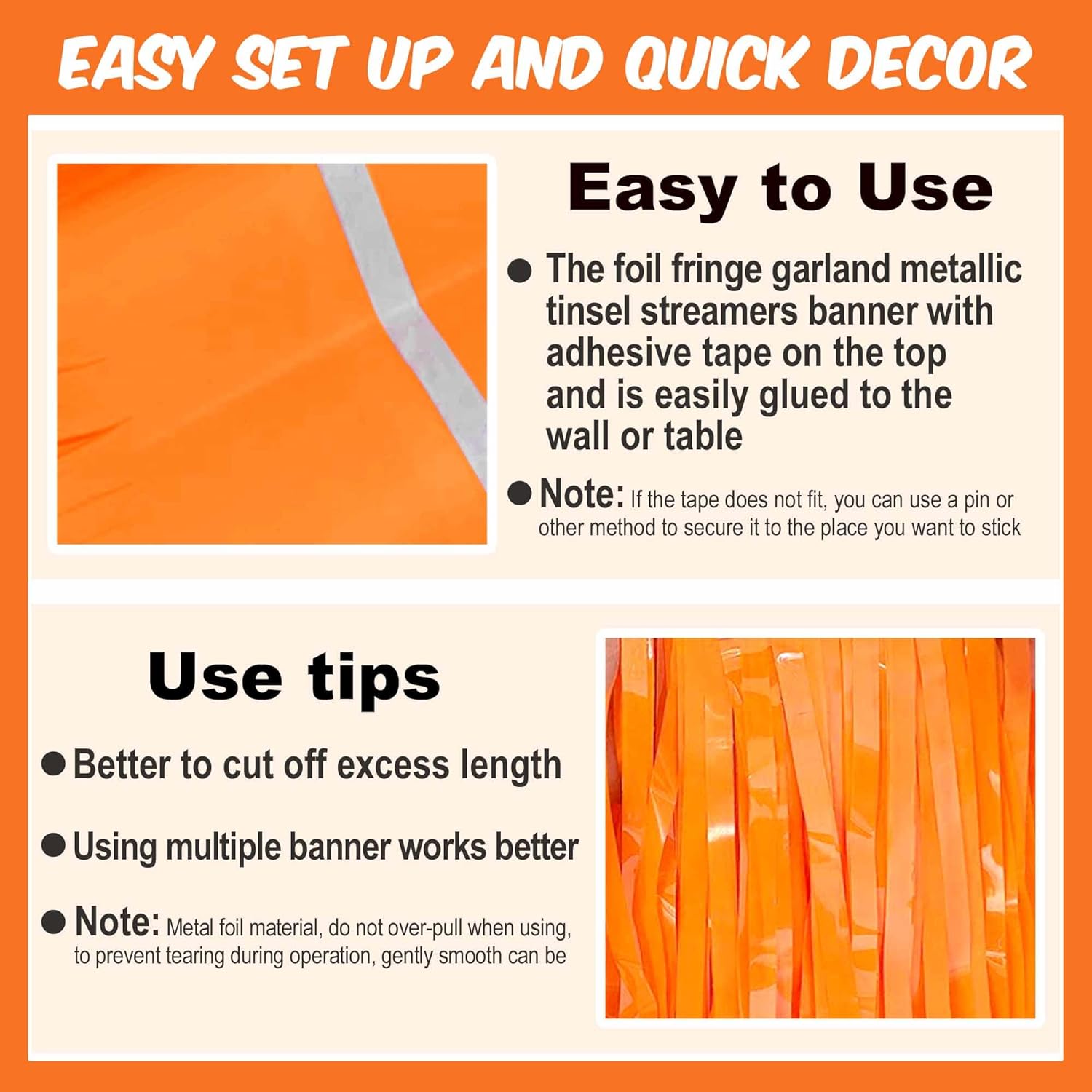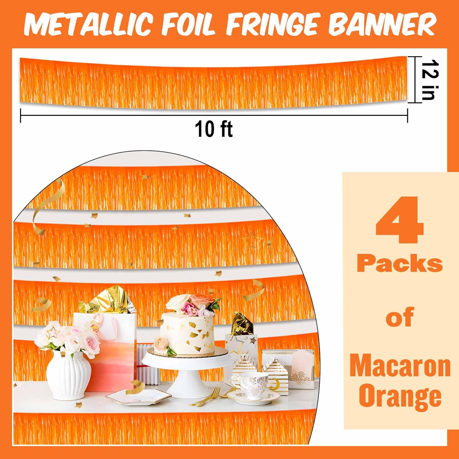 4 Pack 10 Ft Macaron Orange Foil Fringe Garland Metallic Streamers Tinsel Banner Wall Hanging Garland Backdrop for Parade Floats, Halloween, Christmas, Thanksgiving, New Year Party Decorations