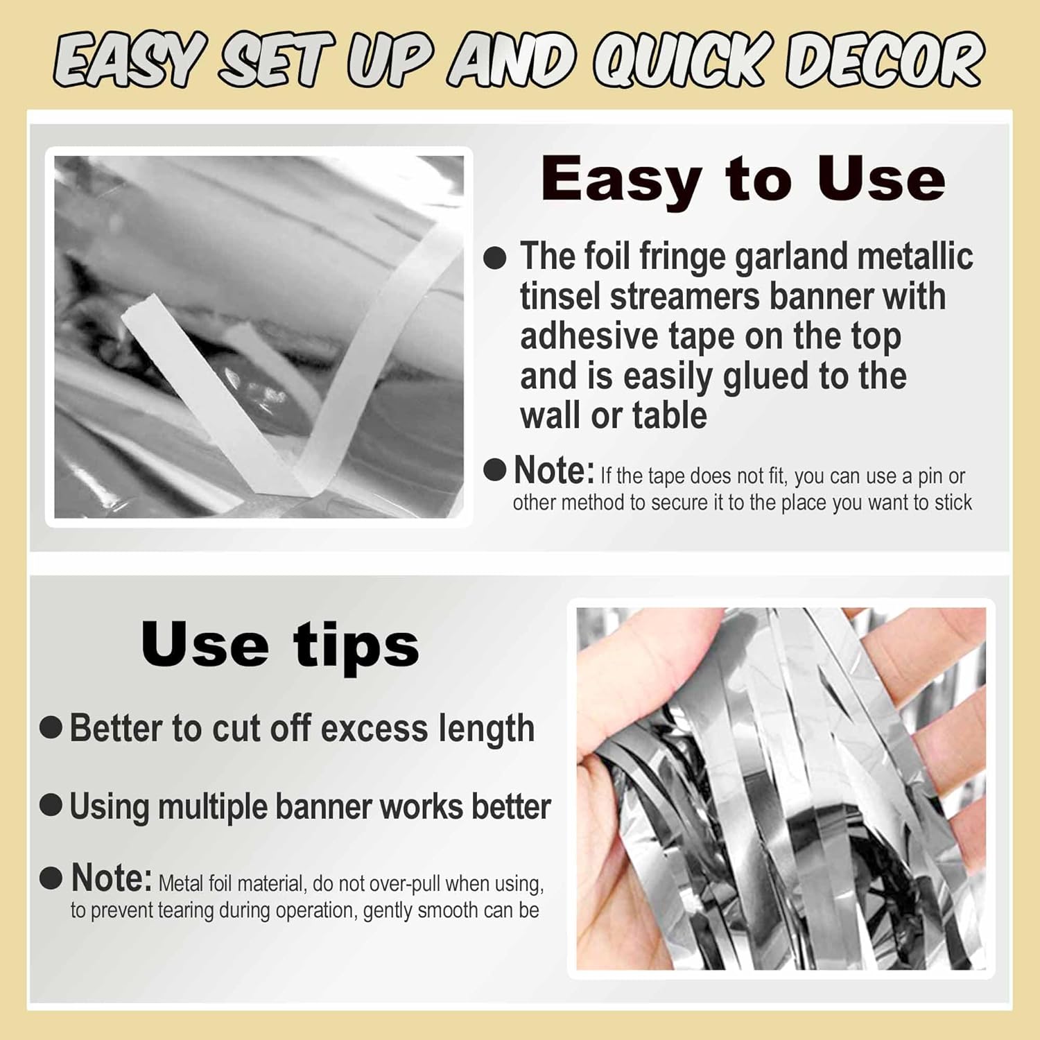 - Easy to Use: Tinsel foil fringe garland banner streamers the back has double-sided tape, gently peel double-sided tape off and it would be very easy to paste on wall, window, table, door, parade float or anywhere you want to decorate, add some festive atmosphere to the party