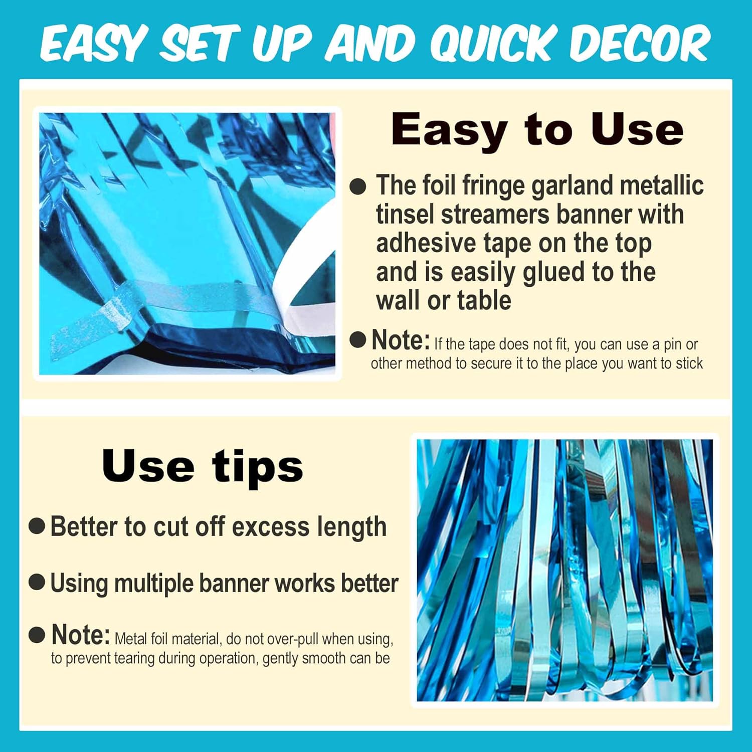 4 Pack 10 Ft Light Blue Foil Fringe Garland Metallic Streamers Tinsel Banner Wall Hanging Garland Backdrop for Parade Floats, Halloween, Christmas, Thanksgiving, New Year Party Decorations