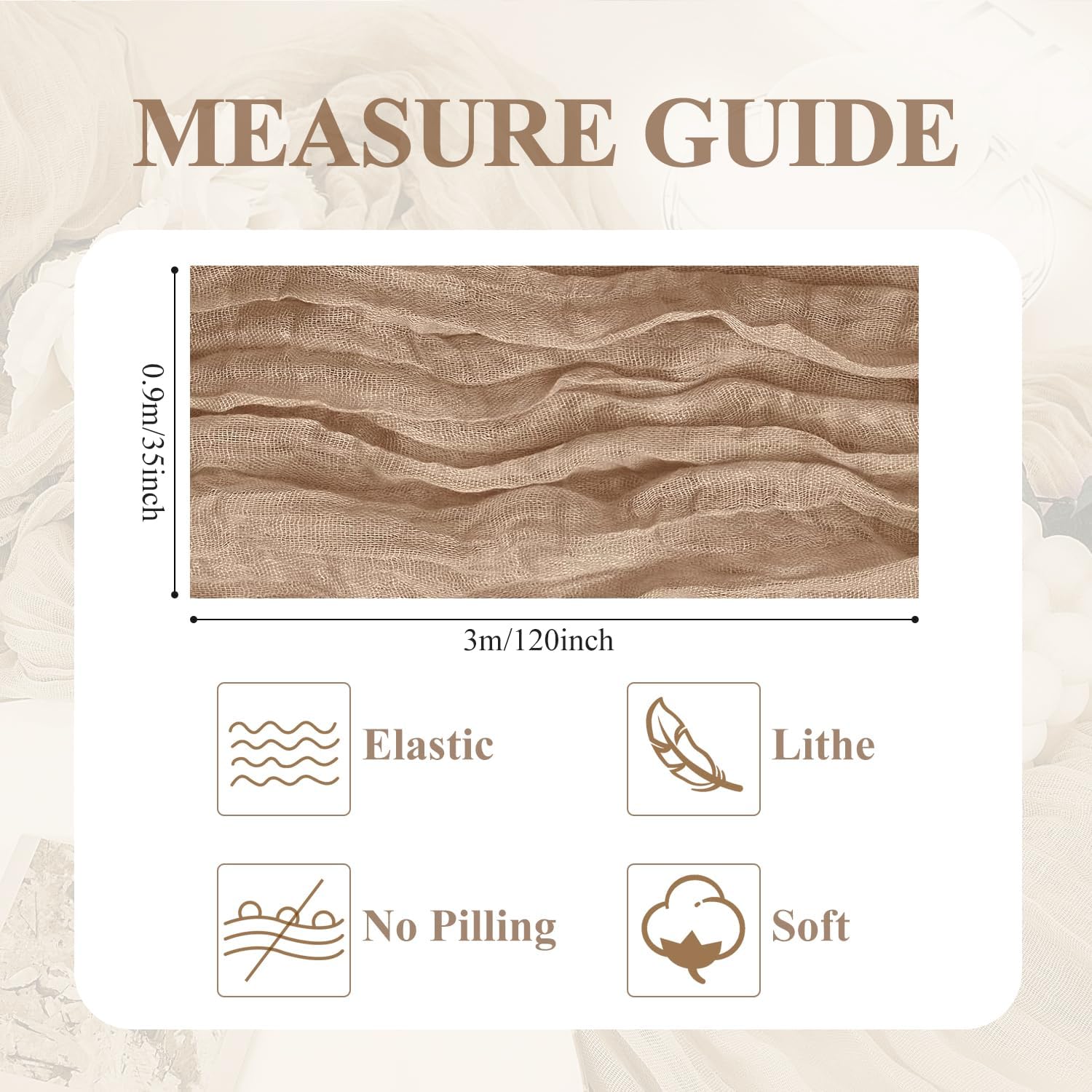 - 【Cheesecloth Table Runner】 Size: 35" W x 120" L. You will get 2 pieces 10FT length cheesecloth table runner. The sheer rustic table runner is long enough to span a large table and drape gracefully across the table. It will gently sway in the wind, adding a romantic atmosphere to your occasion. These eye-catching gauze table runners are ideal for arranging an elegant, stylish tablescape.
