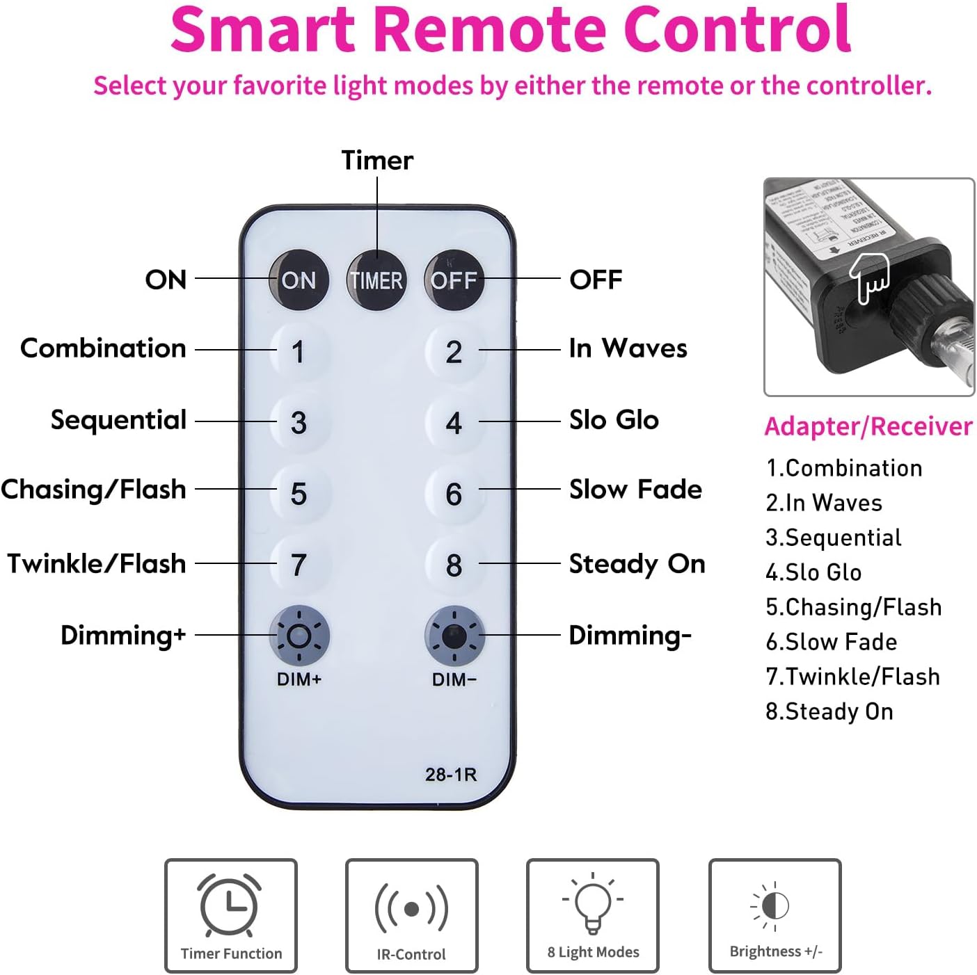 - Multifunction with remote:A. easily control the hanging lights from a distance. B. timeable: 6 hours on and 18 hours off. C. 8 display options: combination, in waves, sequential, slogs, chasing, slow fade, twinkle, steady on. D. 4 options of brightness adjustable