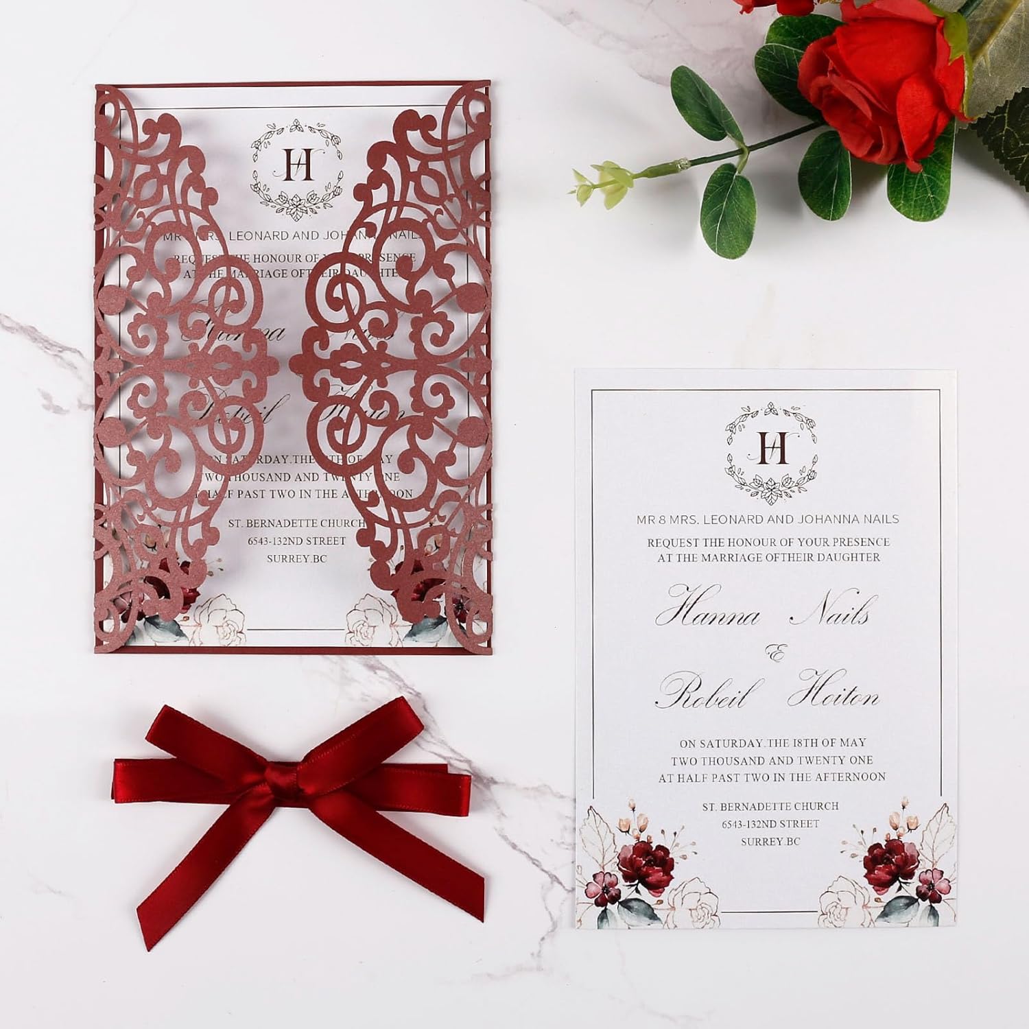 50pcs Burgundy Wedding Invitation Cards Pocket with Envelope Blank Inner Sheets Ribbons laser Cut invitations for Wedding Bridal Shower QuinceañEra Engagement Birthday Invites