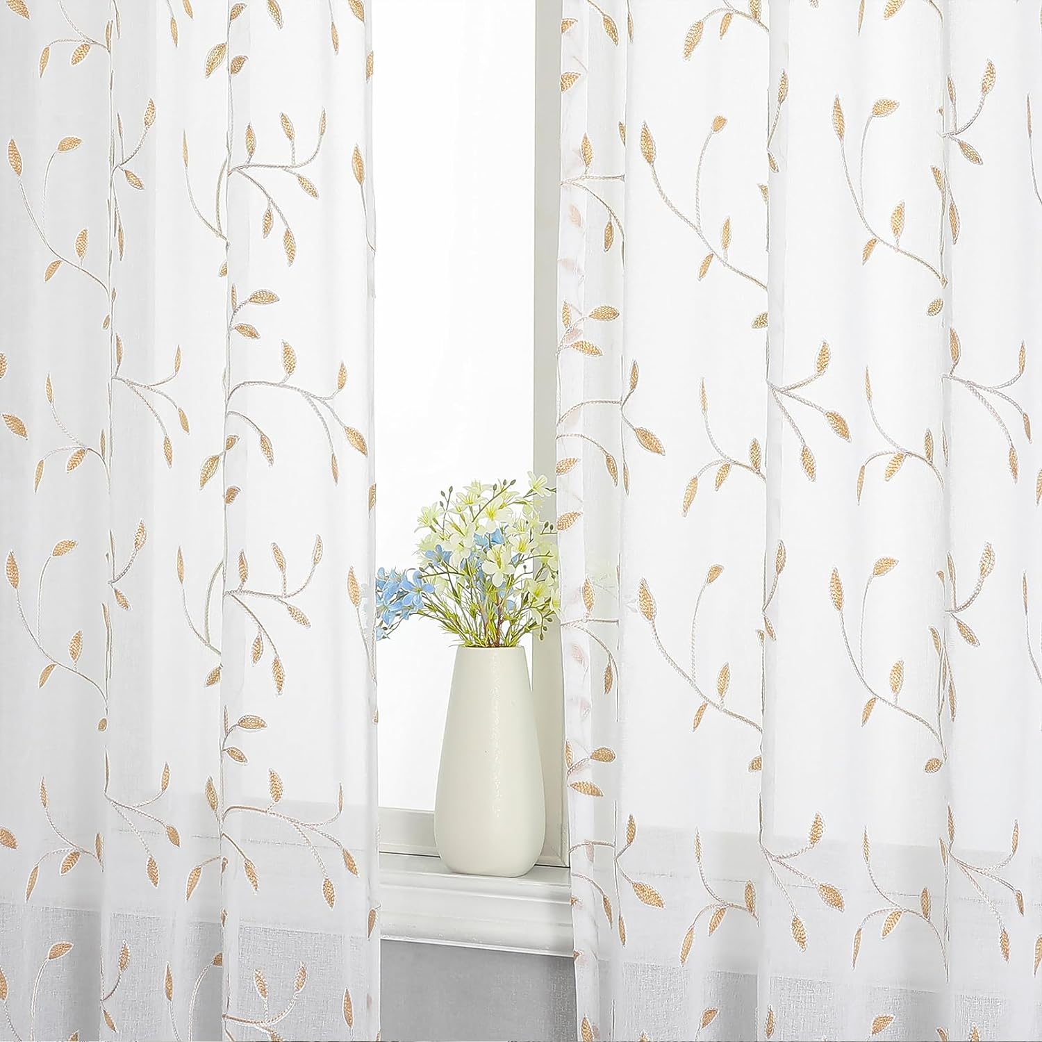 VISIONTEX White Sheer Voile Curtains, Decorative Orange Leaves Embroidery Faux Linen Rod Pocket Window Drapes for Home Kitchen, Living Room and Bedroom 54 x 95 Inch, Set of 2 Curtain Panels