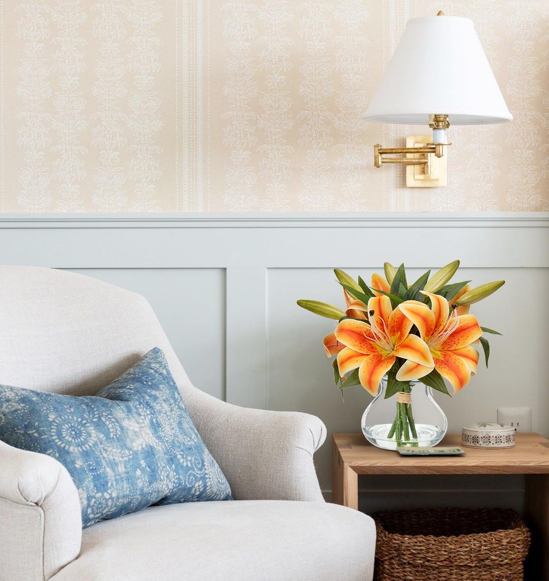 - 💐【Realistic & Elegant】Fall artificial tiger lily flowers with glass vase suits look so beautiful, unique craft design, brings different visual enjoyment to your home, create a romantic atmosphere, make you happy every day. Faux water on the vase adds to the pulchritude and realism. More realistic because of the details!