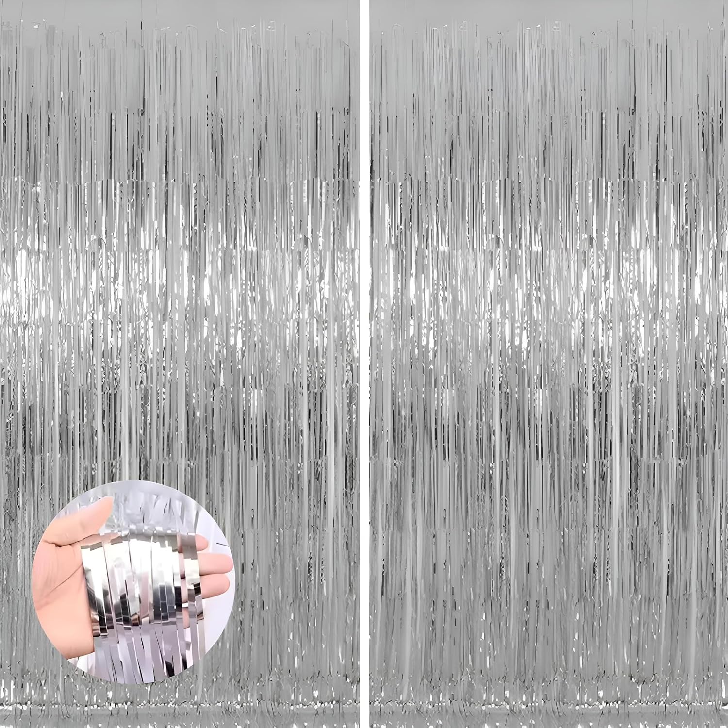 - 2 Pack foil fringe tinsel backdrops: each measuring a whopping 3.3 ft x 8.3 ft.Long enough for indoor or outdoor parties. Also can be cut in suitable length for your birthdays Party decorations These backdrops are perfect for creating stunning party decorations, event backdrops, and photo booths that will leave your guests in awe.