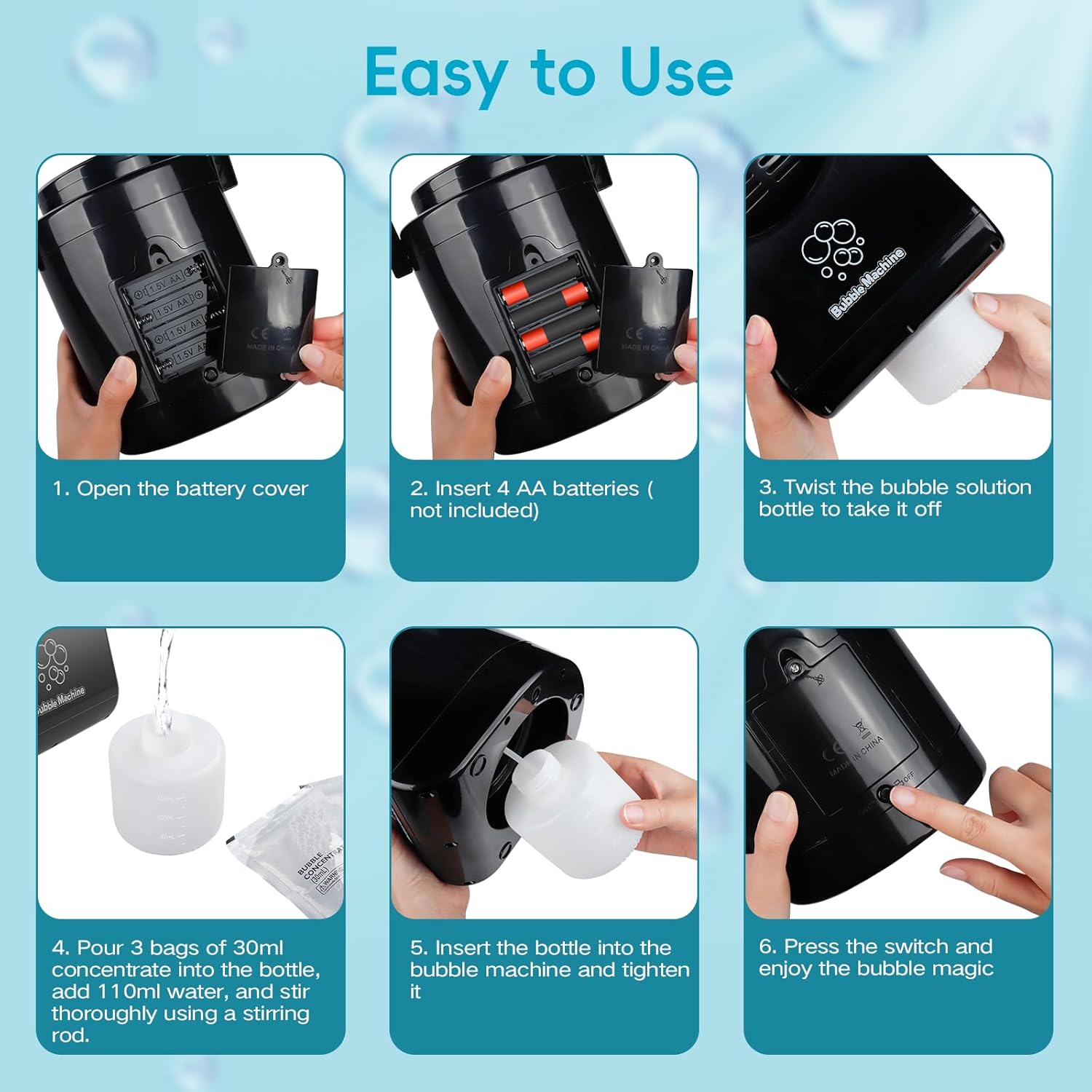 - User-Friendly Operation: Fully enclosed design bubble machine, no water leakage problem, removeable water bottle, comes with 9 packs bubble concentrate, just add 3 bags of 30ml concentrate and 110ml water. Stir thoroughly with the included stirring rod. Press the switch, then It can blow tons of bubbles