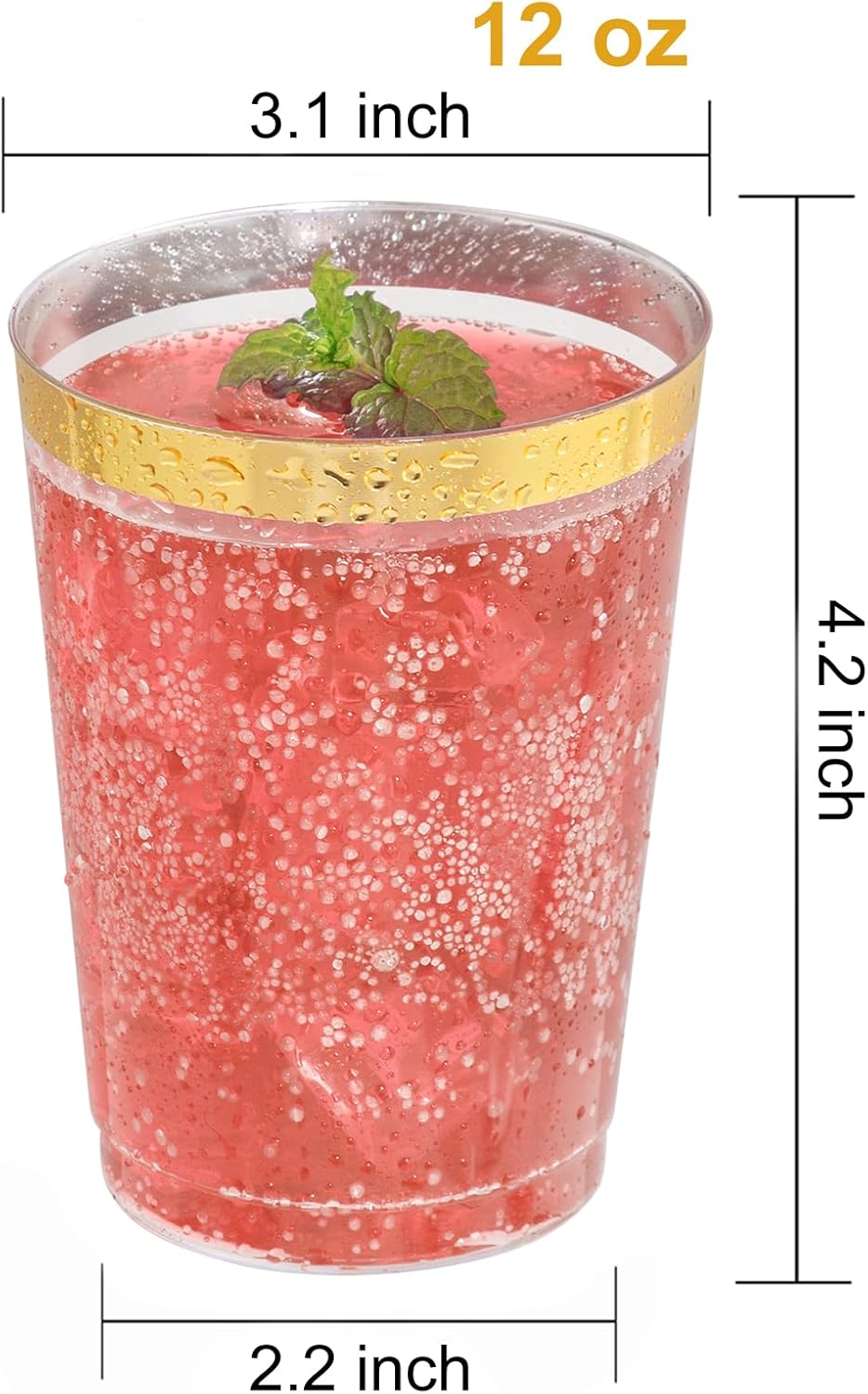 - Elegant Appearance: The 12 oz disposable clear plastic cups with gold trim are crystal clear all over, presenting a high-end appearance for a good clear visibility. The gold appearance and luster make these gold disposable cups look more upscale in any setting.