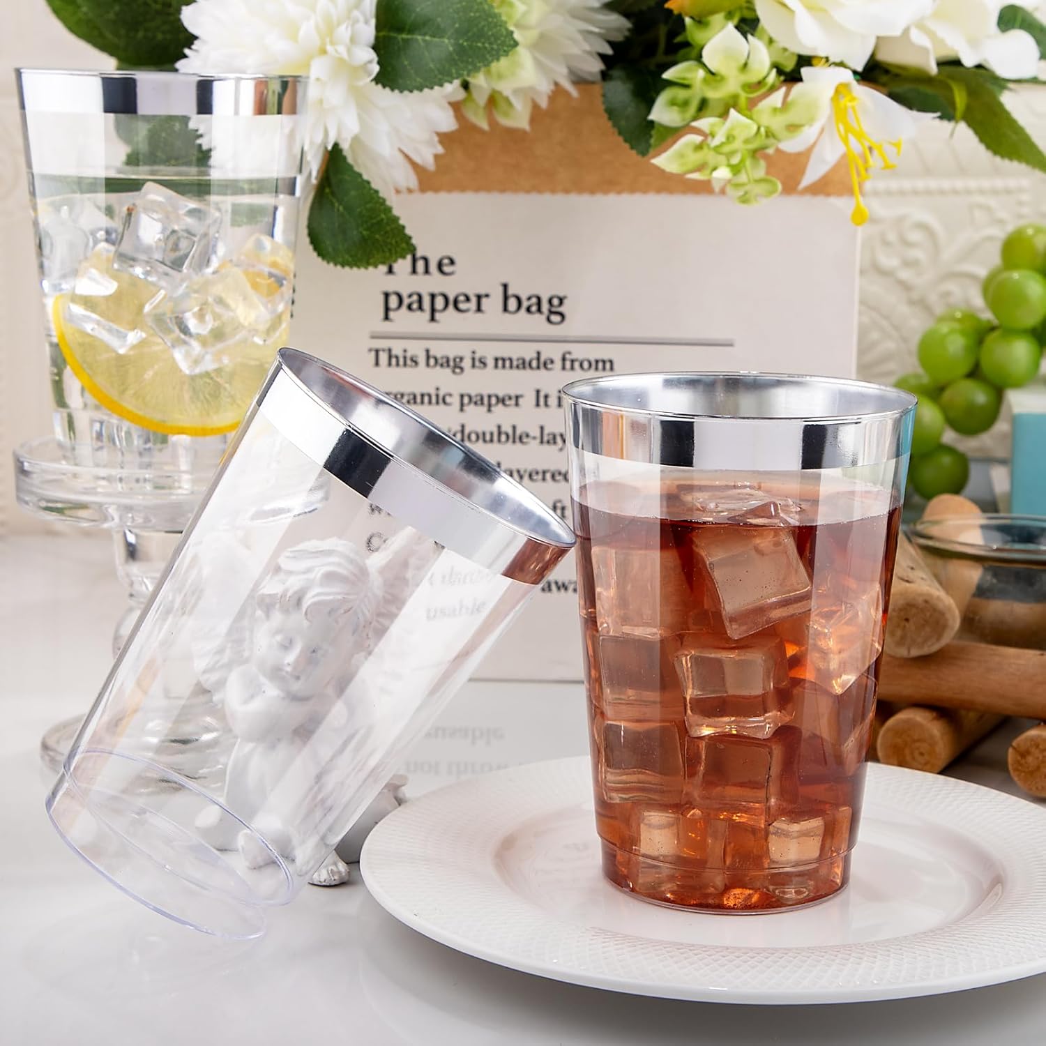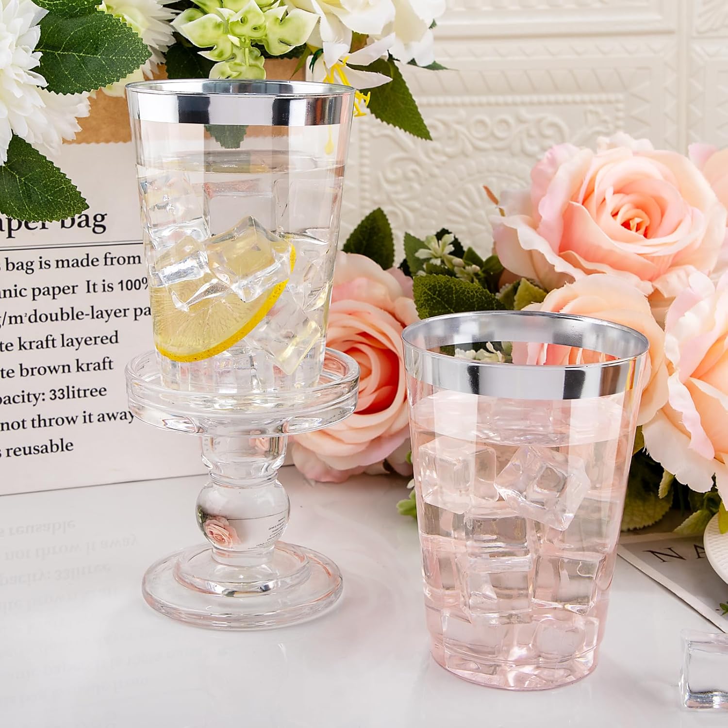 - Elegants Appearence: The 12 oz disposable clear plastic cups with silver trim are crystal clear all over, presenting a high-end appearance for a good clear visibility. The silver appearance and luster make these silver disposable cups look more upscale in any setting.
