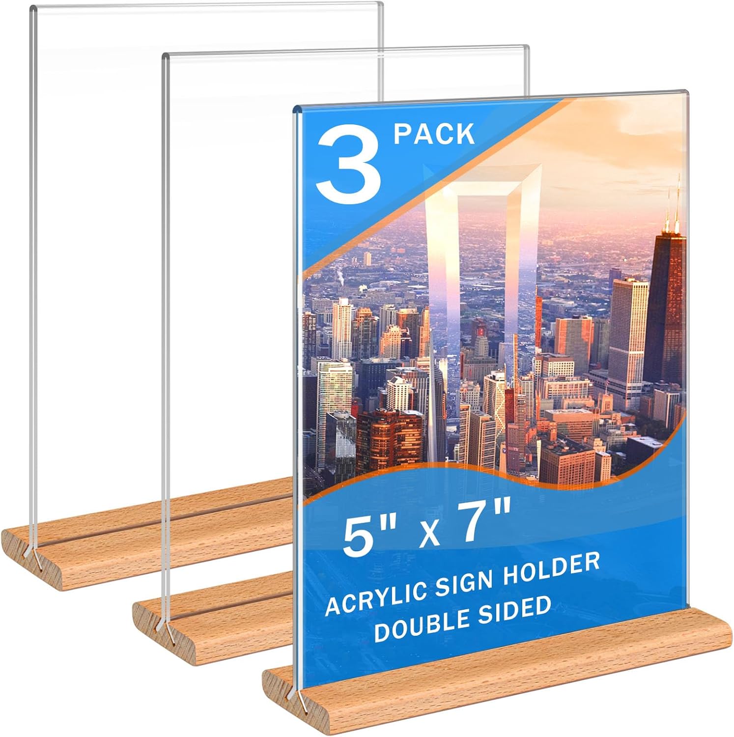 Kersally Acrylic Sign Holder 5 x 7, 3 Pack Double-Sided Clear Table Display Stands with Wood Base,Vertical Acrylic Frame Menu Flyer Paper Holder for Stores, Restaurants, Hotels, Office, Show Fair