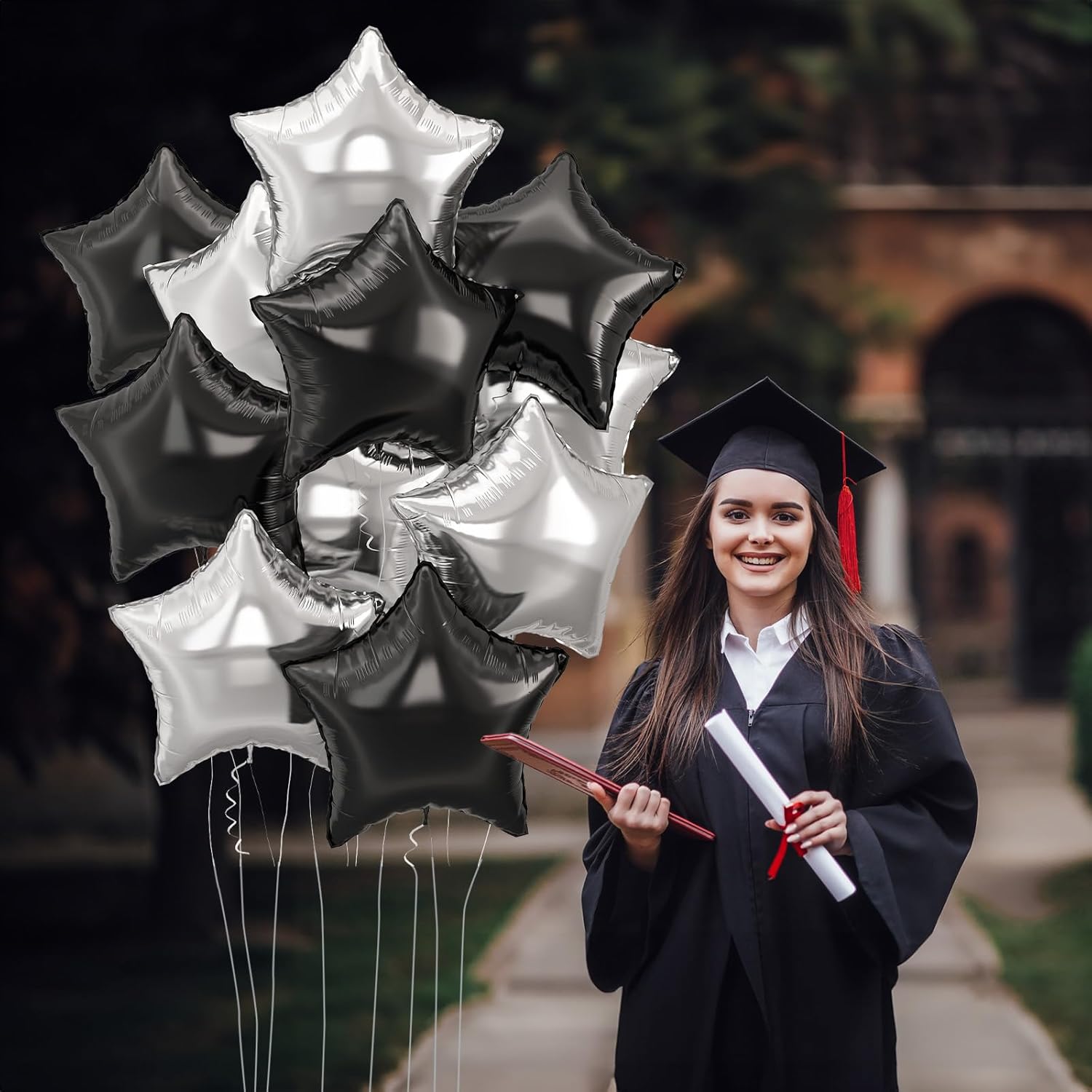 Black Silver Star Foil Balloons, 18 Inch Large Black and Metallic Silver Stars Shape Aluminum Foil Helium Balloon 10 Pcs Pentagram Balloons Party Decor for Birthday Graduation Retirement New Year