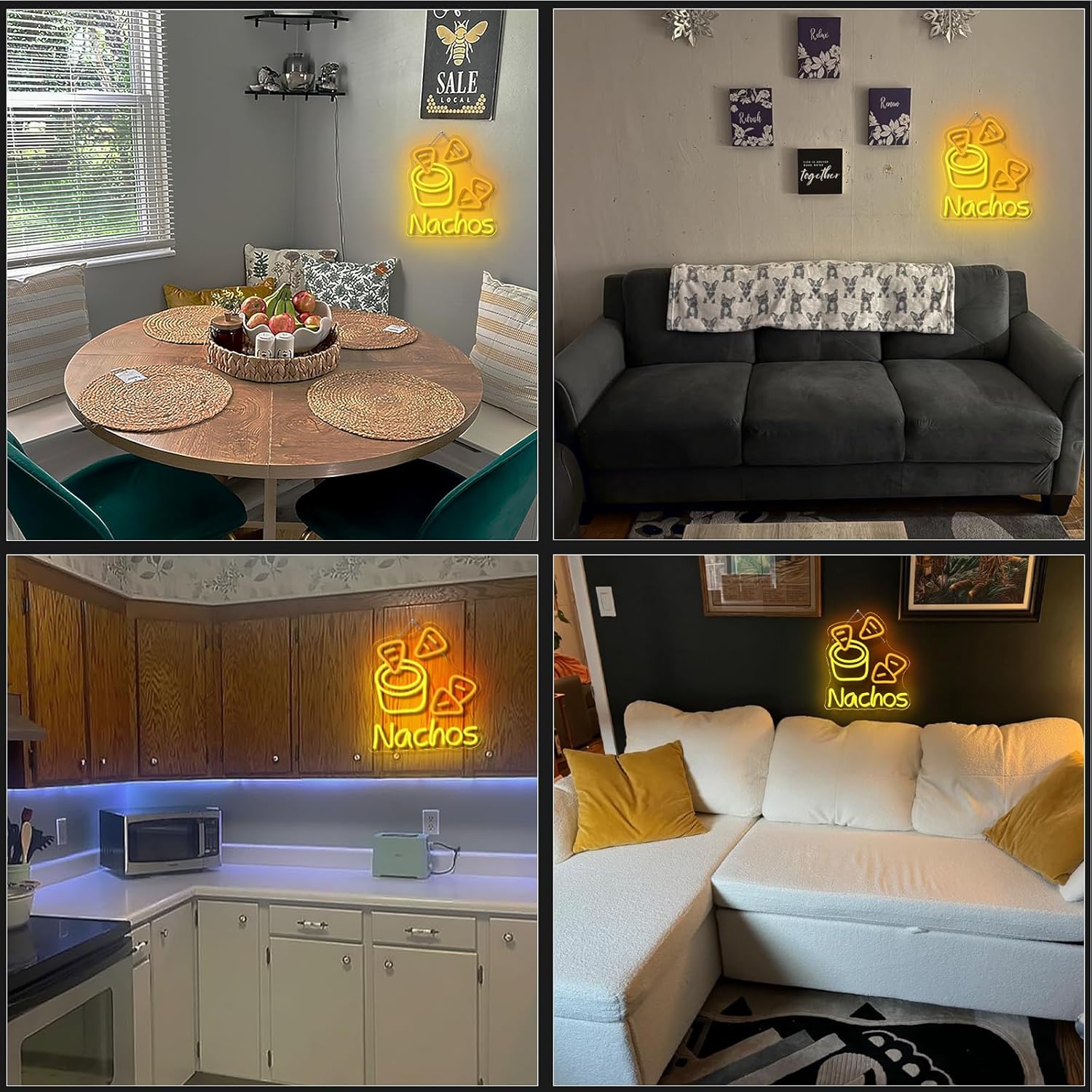- Irresistible Foodie Decor: Bring the joy of snacking to life with this vibrant neon sign featuring a delicious bowl of melted cheese and tempting tortilla chips, all crowned with the word NACHOS.