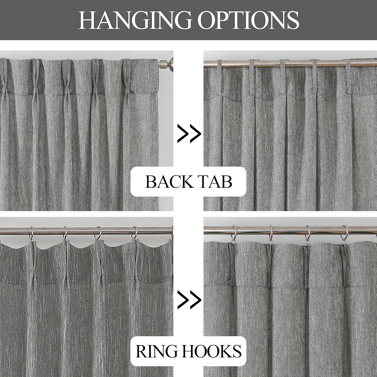 - Multiple Hanging Ways:Rustic Casual curtains have many hanging options to meet your different home décor needs:back tabs(4 inch),clip rings,ring hooks or for track system.Please note that 18 hooks are in the package but clips and rings are not included.Two weighted hems sewn at the bottom increase the draping effect.Moving the pinhooks position to adjust the total height by 1-2 inches