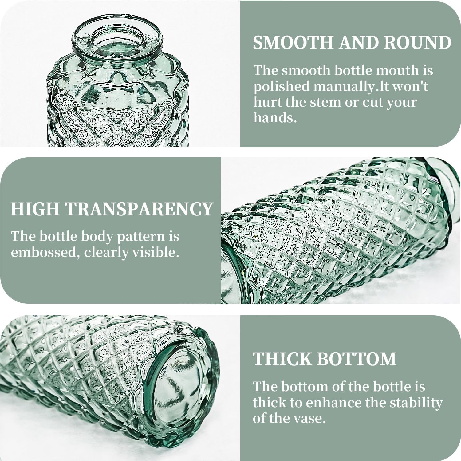- 🍀【THICKENED MATERIAL】These charming small vases are made of thick and sturdy glass, durable and unbreakable. The patterned finish gives them. a textured look and sparkles in the light. Simply insert a flower stem and fill with water, stones or colored gems.