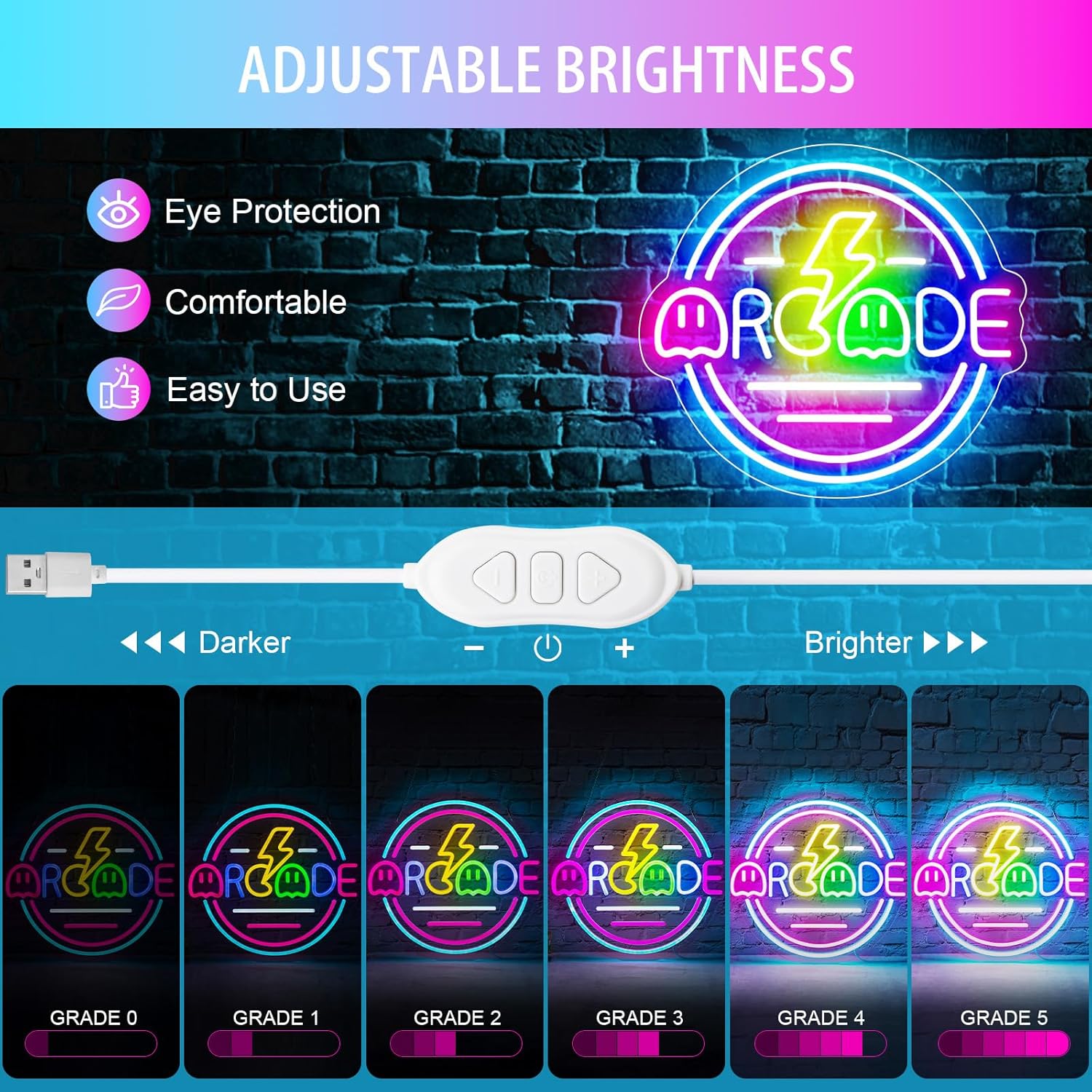 - đăUPGRADED - DIMMABLE BRIGHTăBasaneon Gaming neon signs have upgraded the adjustable brightness(5 levels of brightness), you can use the dimming button to control brightness to achieve the desired effect, Different games require different atmospheres and brightness, because I am also a player and I have a clear understanding of each player's needs, believe our video game neon light can give you a happy gaming experience.