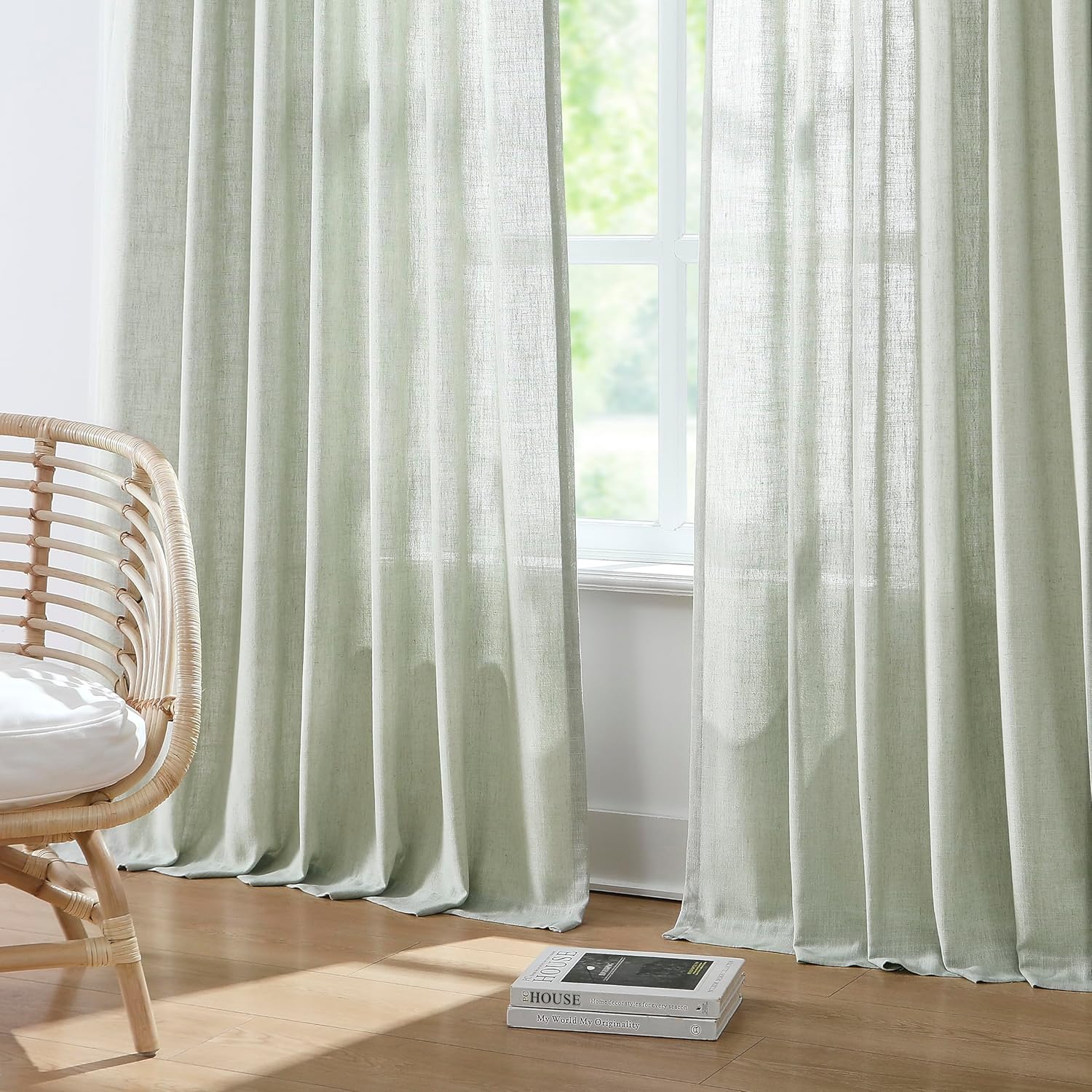 Vision Home Soft Green Pinch Pleated Semi Sheer Curtains Textured Linen Blended Light Filtering Window Curtains 120 inch for Living Room Bedroom Pinch Pleat Drapes with Hooks 10ft 2 Panels 40"Wx120"L