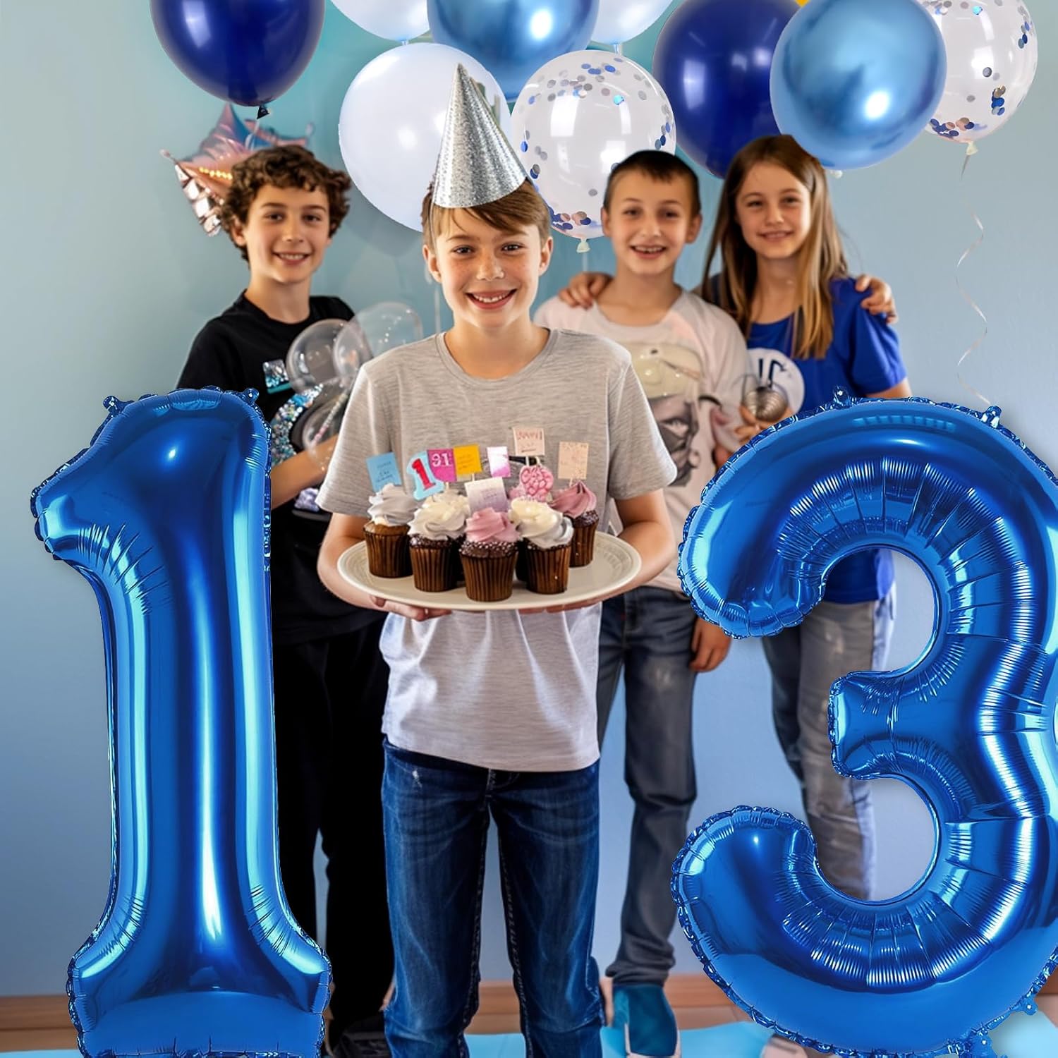 - π Dark Blue Number 13 Balloon: Our package included 40 inch foil number 13 balloon(2pcs), 12 inch metallic blue balloon(4pcs), blue silver confetti balloon(4pcs), pastel blue balloon(4pcs), Light Navy Blue Balloon(2pcs), 1pcs straw and 1 roll ribbon. Simply inflate the balloon using the straw, and you're ready to party! Navy blue number foil balloons are the best for girls or boys birthday party decoration.