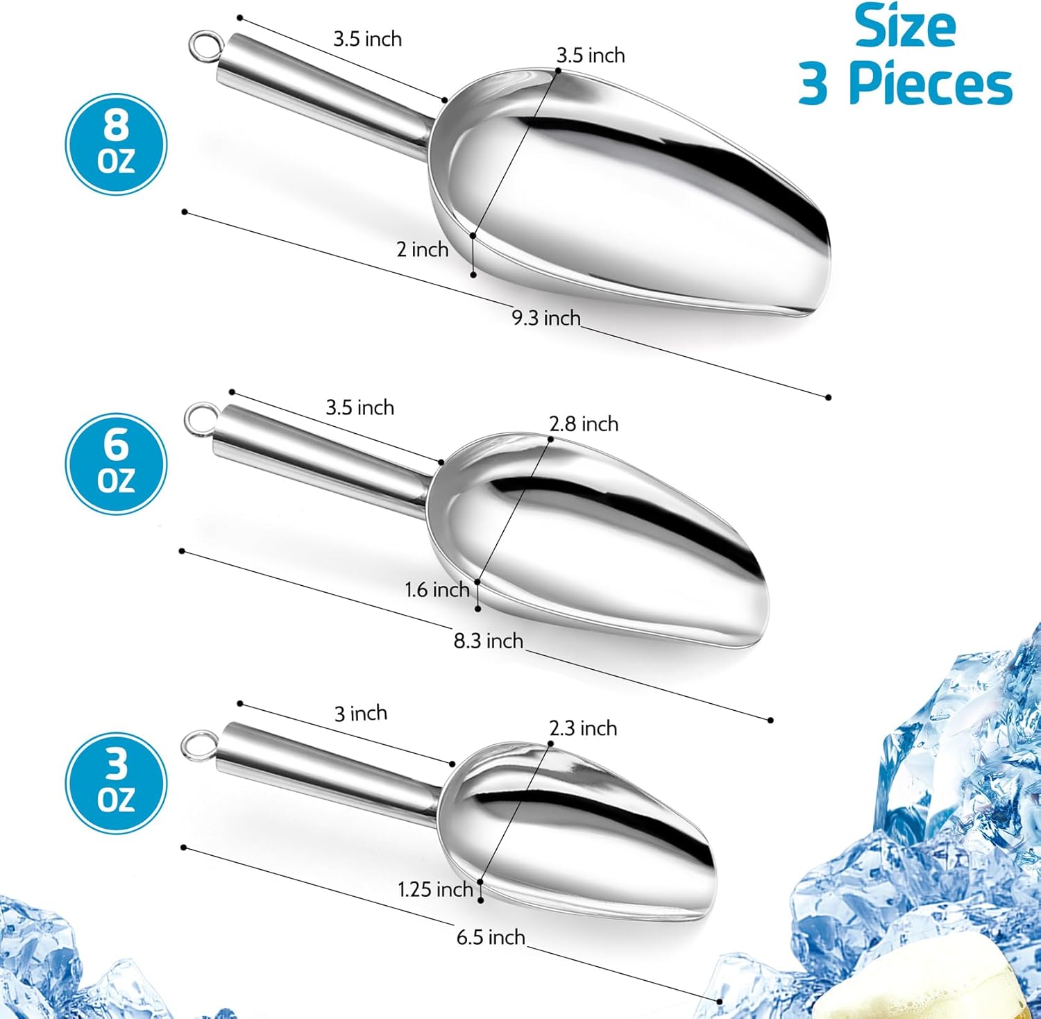 - 【3 + 6 + 8 Oz, 3 Pieces】 3-piece different sizes scoops from small to large would meet all your using needs in kitchen, bar, buffet, party and garden, Can easy to scoop ice cube, candy, popcorn, pet food, sand and soil, Lightweight and utility for daily use, Good gift for wedding, birthday or house-warming