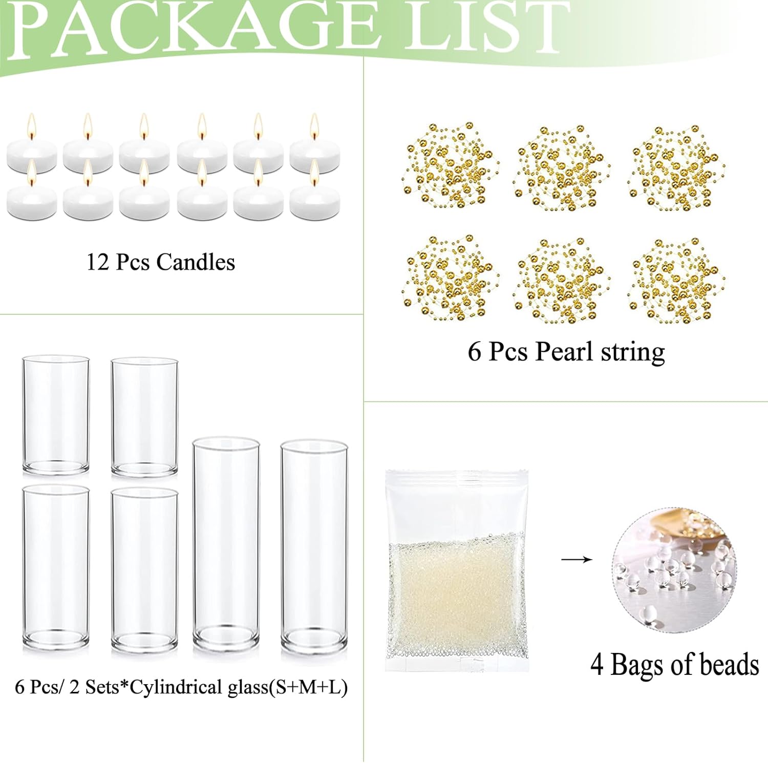 - Package Includes: You will receive 6 glass cylinder vases in 3 sizes, 2 of each size, 12 white floating candles, 6 pearl string, which can be put into use separately or in combination to meet your daily use and replacement demands