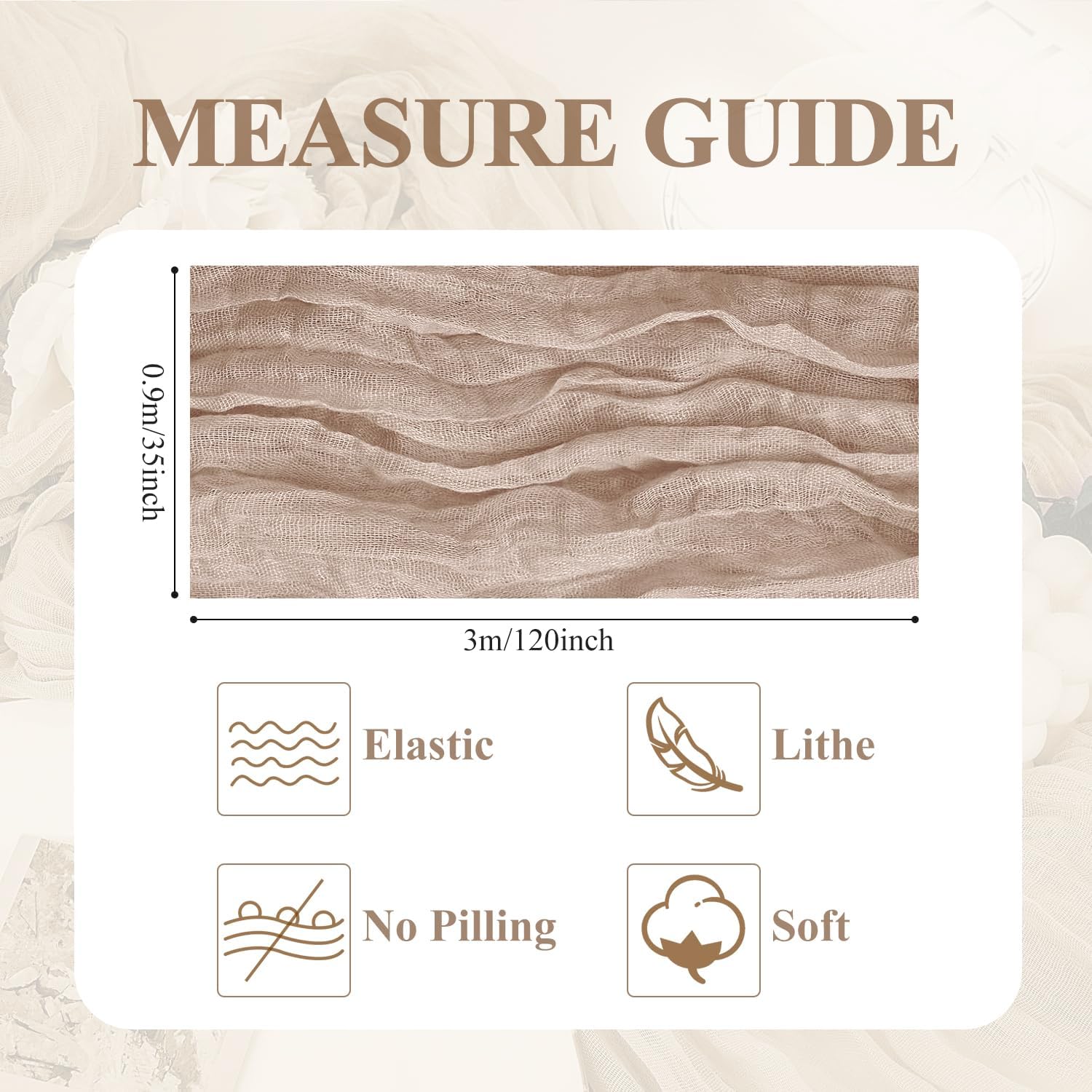 - 【Cheesecloth Table Runner】 Size: 35" W x 120" L. You will get 3 pieces 10FT length cheesecloth table runner. The sheer rustic table runner is long enough to span a large table and drape gracefully across the table. It will gently sway in the wind, adding a romantic atmosphere to your occasion. These eye-catching gauze table runners are ideal for arranging an elegant, stylish tablescape.