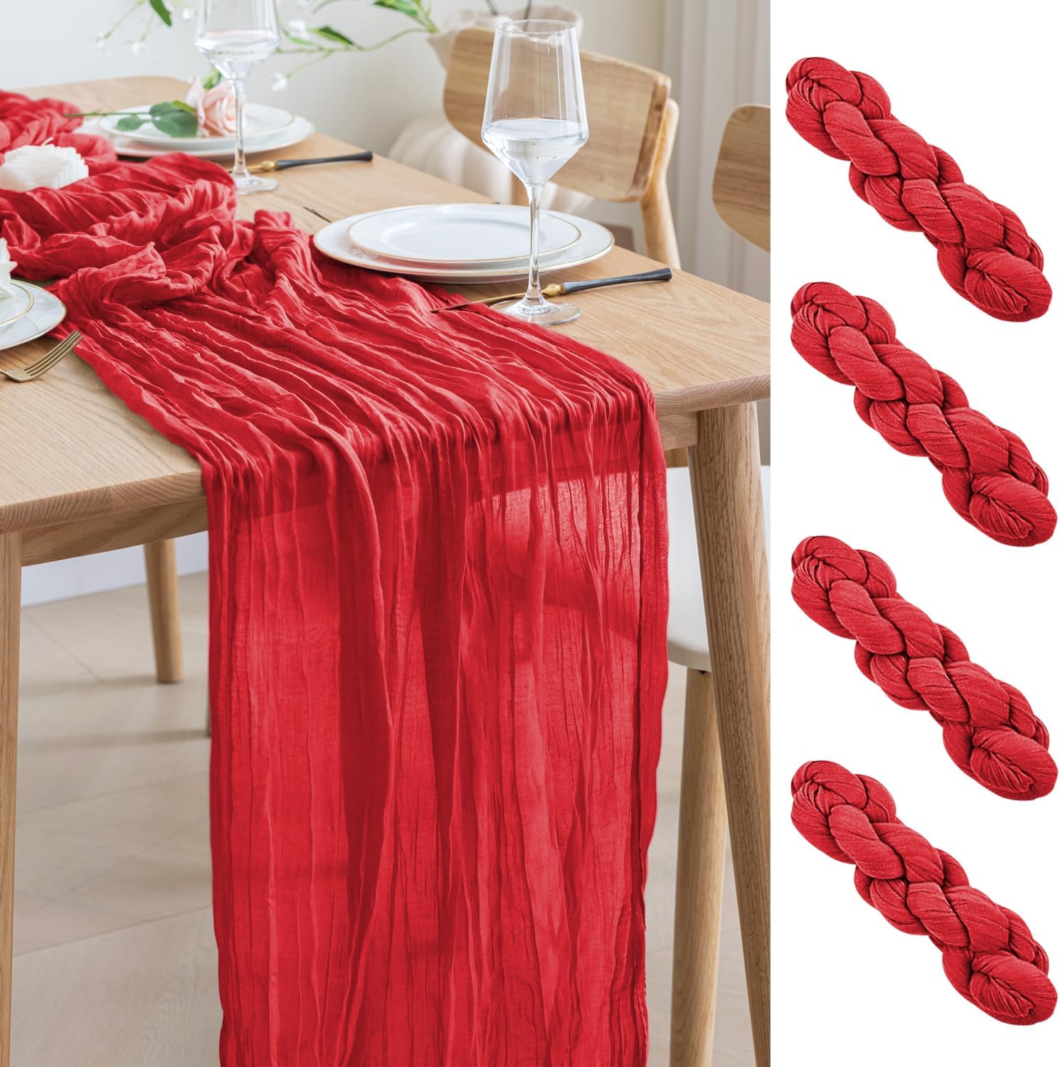 Asee'm 4PCS Fall Table Runner Cheesecloth 10FT Red Boho Gauze Fabric Rustic Sheer Cheese Cloth Runners for Thanksgiving Christmas Wedding Bridal Shower Party