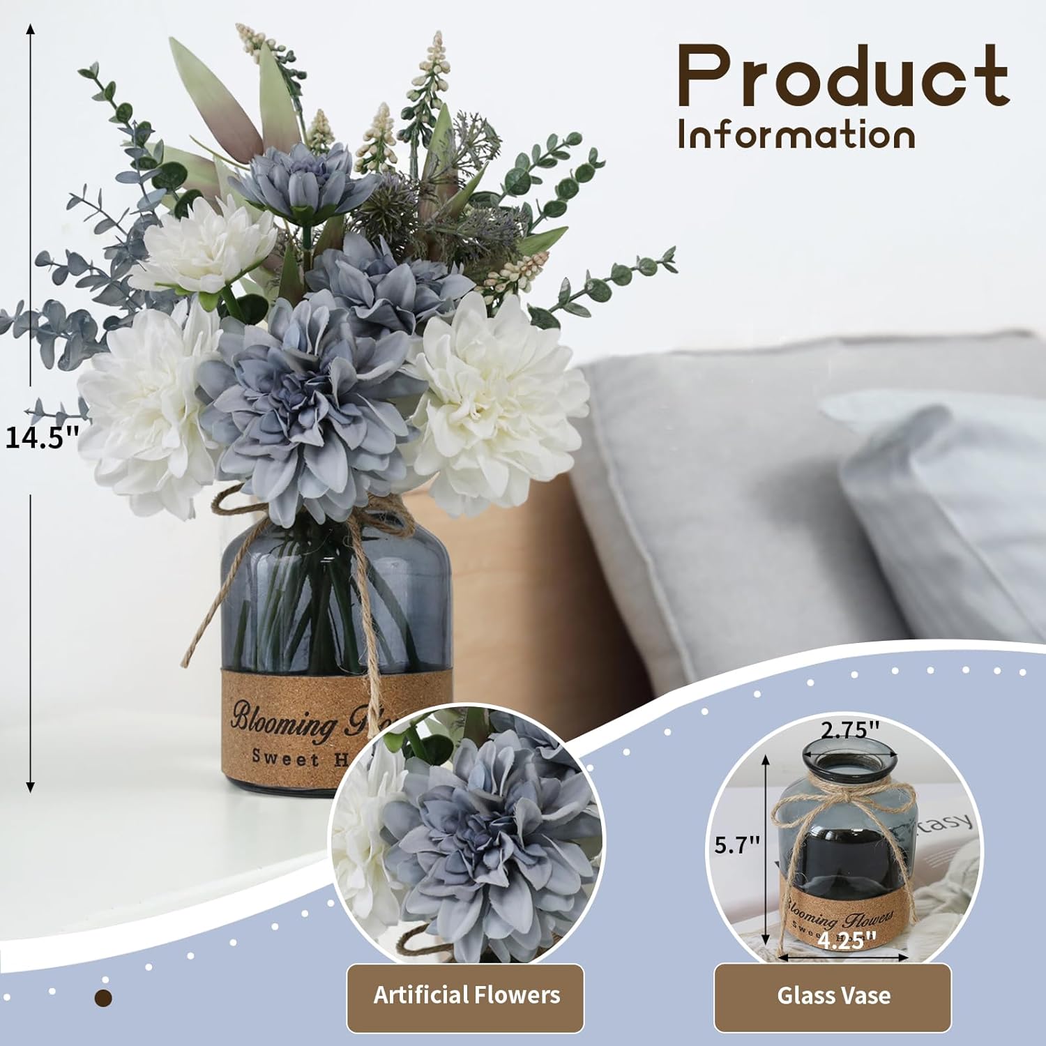 - Fake Flowers in Vase:Artificial flowers for decoration include 6 blue and white artificial dahlia flowers,fake plants,eucalyptus stems,willow leavesa and glass bottle,the glass bottle mouth is tied with hemp rope and tied in a bow