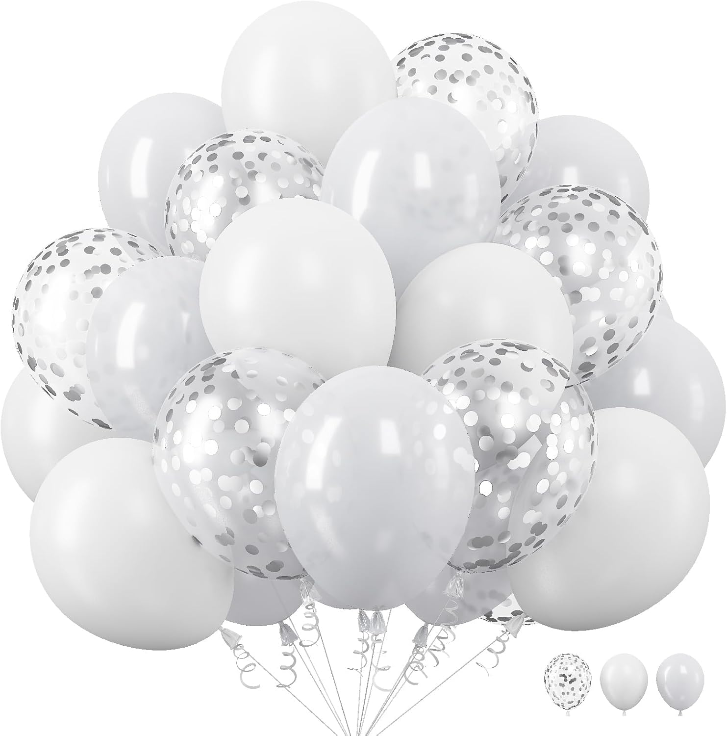 - White Mixed Ballons Set: 30Pcs 12 Inch latex party decoration balloons, include 10pcs pearl white balloons, 10pcs matte white balloons, 10pcs silver confetti balloons and 1pc white ribbon.