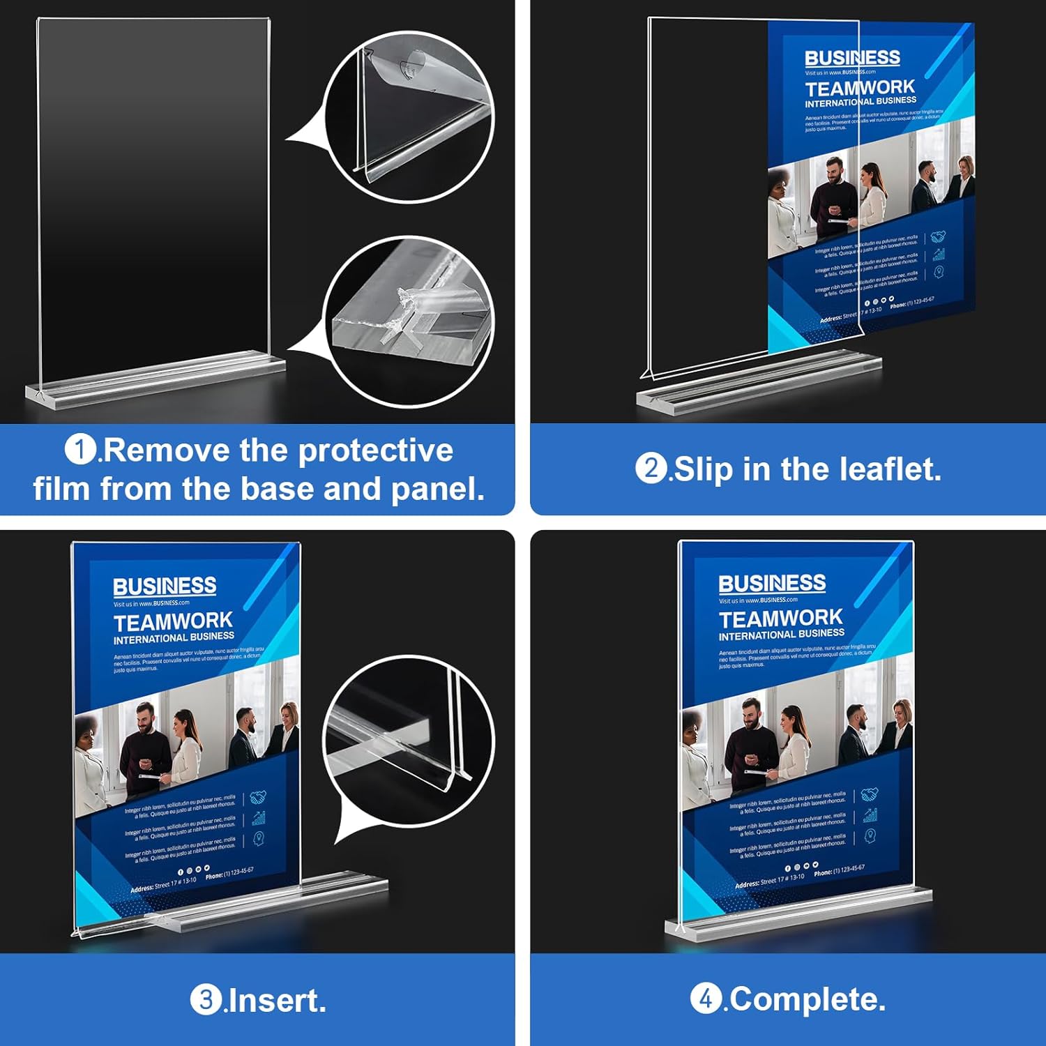 - 【Double Sided Sign Stand】This 10Pack acrylic sign holder 8.5 x 11 is designed with a vertical double sided stand. Typically, people prefer this double-sided holder rather than slant-back ones. Because these double-sided holders allow you to display on both sides, but slant back ones, which only allow you to display on one side