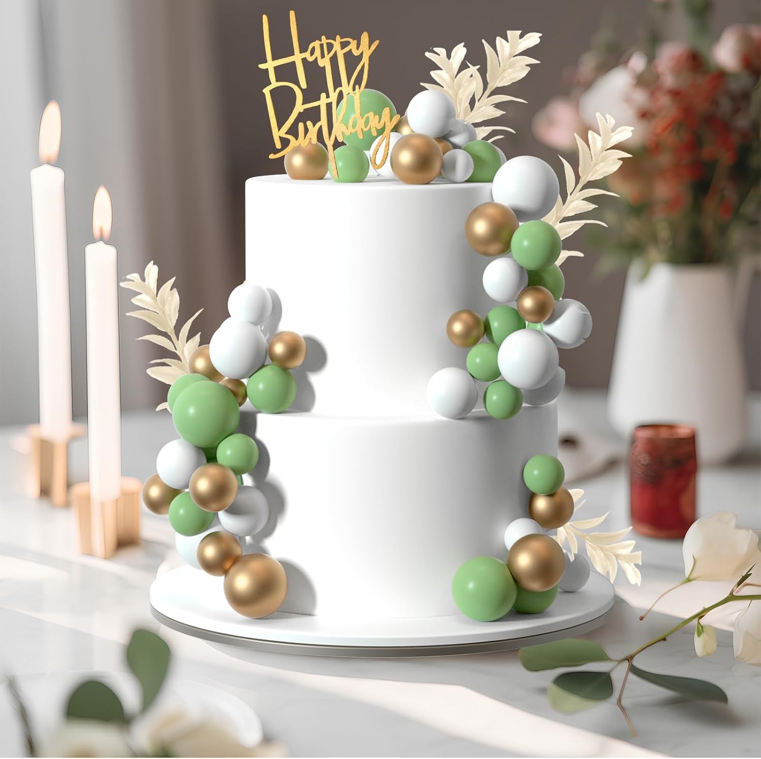- Package included : 10pcs white grass cake toppers, 1pc happy birthday cake topper, 14pcs green balls, 14pcs gold balls, 14pcs white balls.