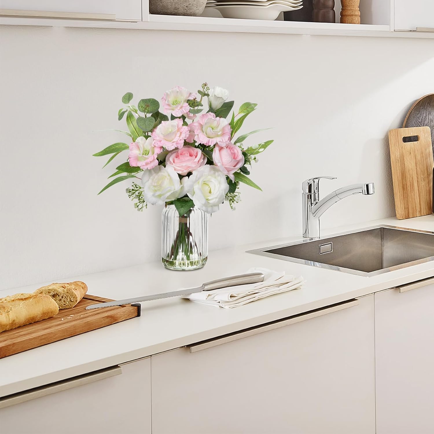 - 💐【Faux Flowers in Vase】Roses faux flowers in vase include 8pcs pink artificial silk roses, eucalyptus stems and some decorative leaves, and a beautiful glass vase, perfect for coffee table centerpiece and dining table centerpiece decor.