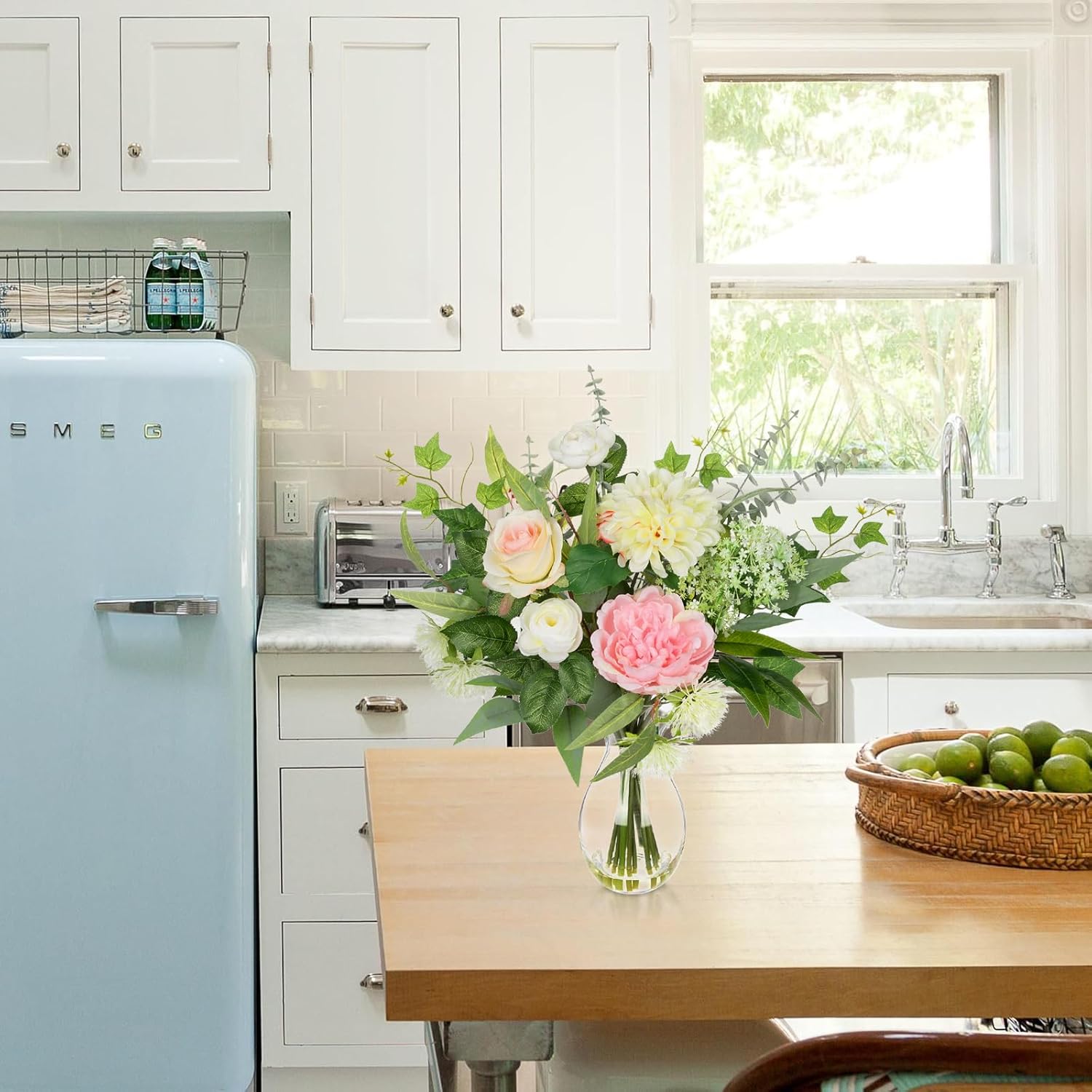 - VERSATILE DÉCOR FOR ANY OCCASION: Ideal as a dining table centerpiece, coffee table accent, or wedding and event décor. This floral arrangement with faux water in vase brings elegance to both modern and classic interiors.