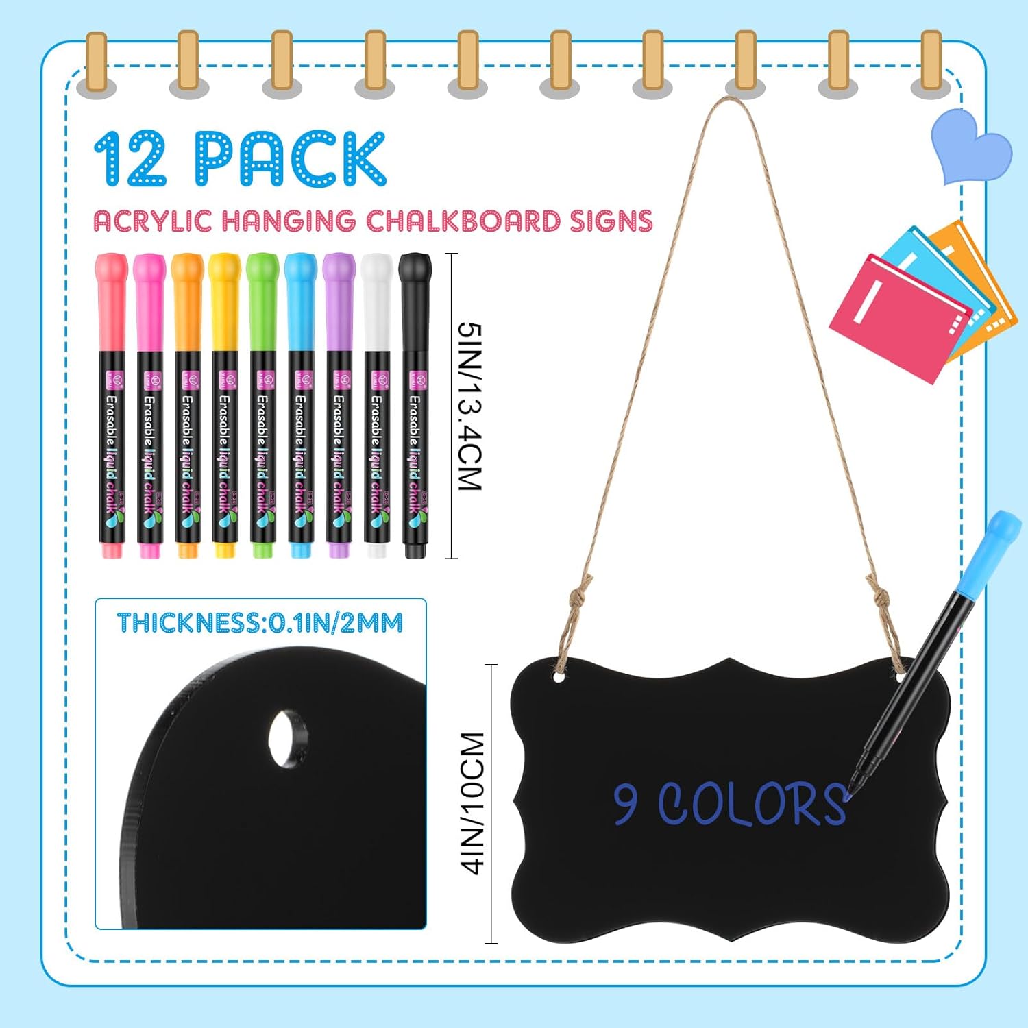 - Complete Set: when you buy this product, you not only get 12 chalk board, but also a set of 9 colorful liquid chalks, 9 colors, bright and easy to remove; Compared with traditional chalk, there is no dust flying, creating a healthier and more comfortable writing environment, which is a very cost effective choice