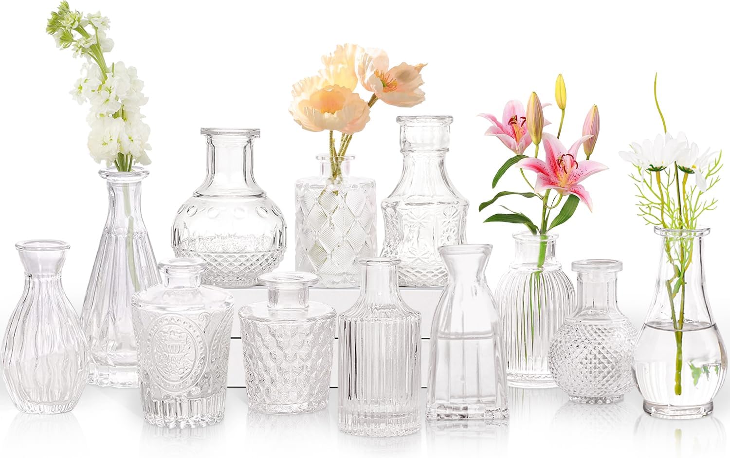 Glass Bud Vases Set of 12, Vintage Small Vases for Flowers, Clear Crystal Mini Glasses in Bulk, Small Flower Design for Centerpieces Wedding Decorations Home Flower Party Decor