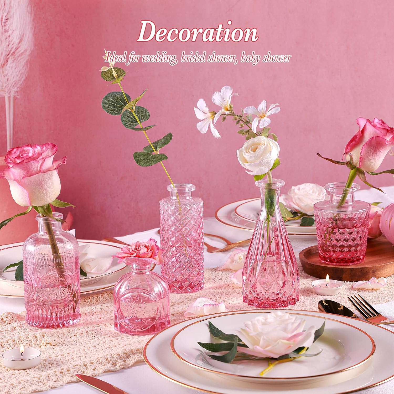 Pink Glass Bud Vases Set of 5, Mini Flower Vase for Centerpieces, Small Clear Vases in Bulk for Wedding Decorations, Vintage Vase for Table, Home Décor