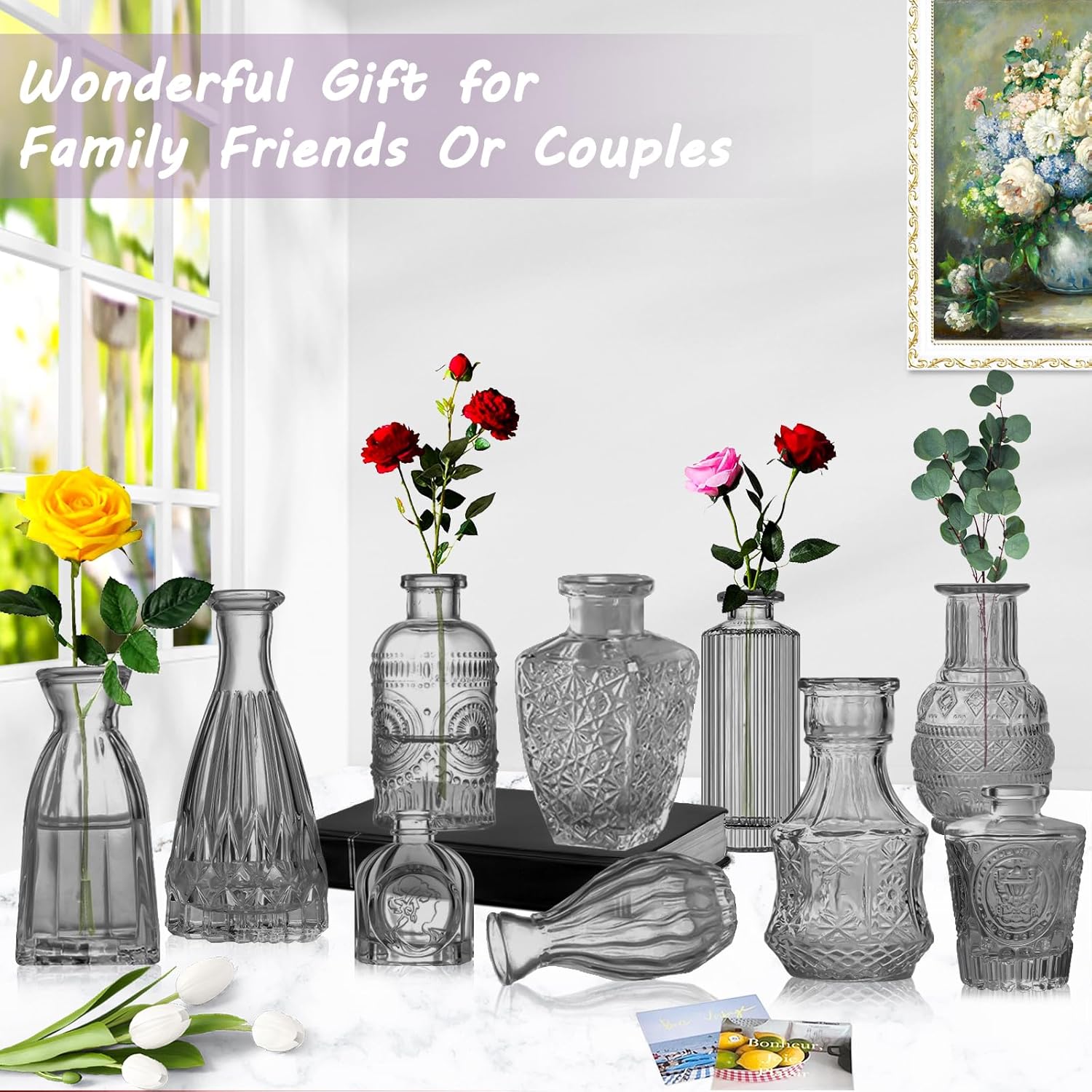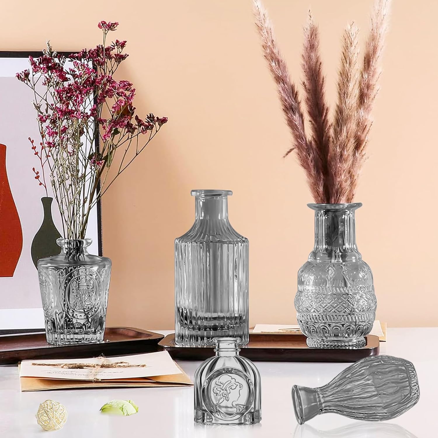 - Thick and Sturdy: Our glass vases bulk is made of thick and sturdy glass, strong and not easily broken. Each small glass vases floreros has a thickened base for stability, and the textured pattern on the surface of small vases for flowers adds a unique touch, injecting an element of sophistication to create a fun and captivating visual effect.
