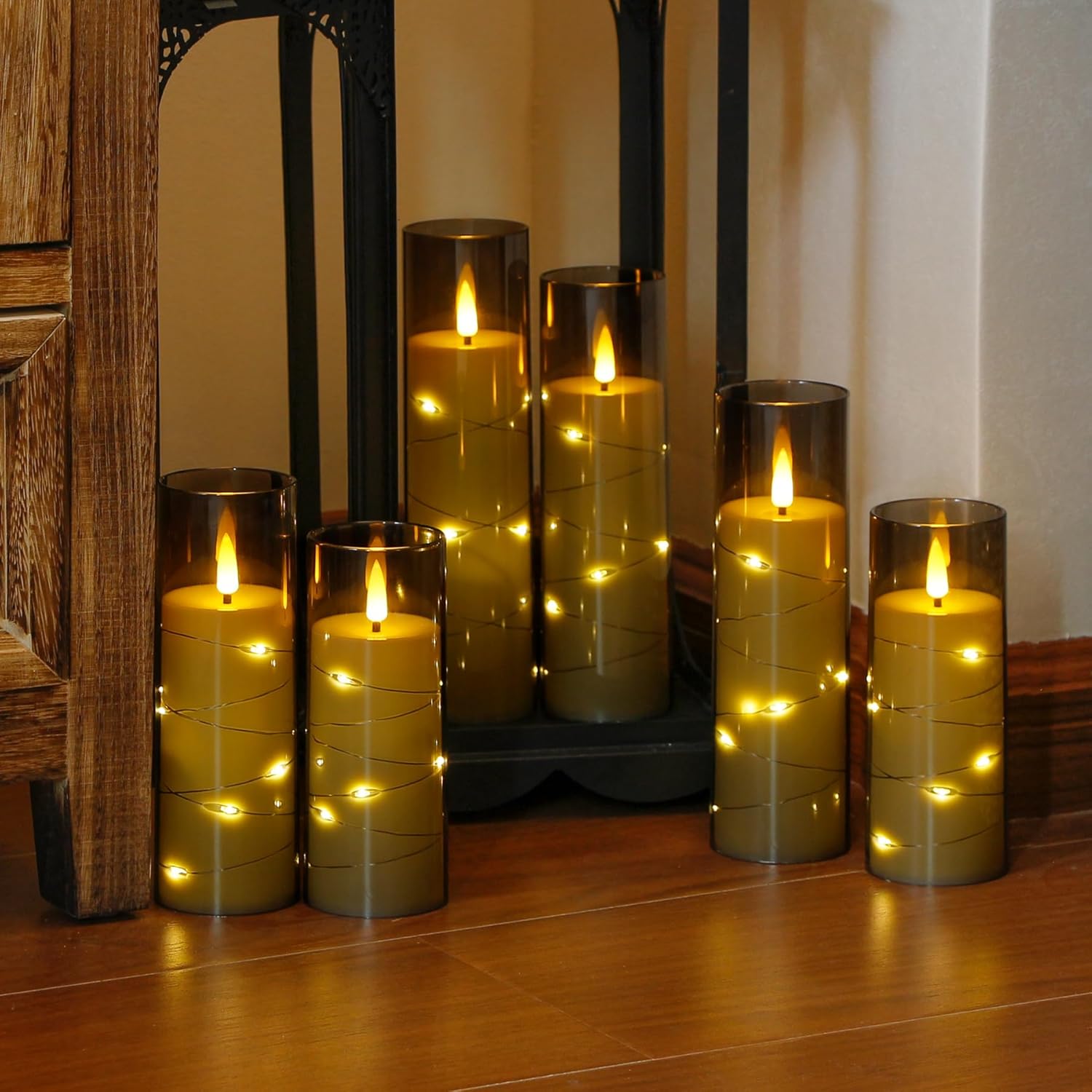 Grey Flameless Candles with Remote and String Light, 2.2"x 5",5",6",7",7",8" LED Battery Operated Plastic Flickering Timer Pillar Candles(Pack of 6,Turn On/Off String Light Mode)
