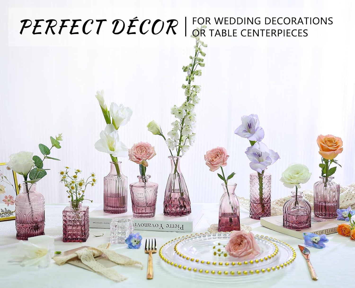 - ELEGANT VINTAGE STYLE: This set includes 12 purple glass bud vases, each adorned with delicate etched patterns for added charm. These flower vases boast a classy vintage design, suitable for any occasion, from casual to formal. Spruce up your window sill, dining table, or wedding reception with these beautiful vintage décor vases, creating an elegant centerpiece that will captivate all who see them.