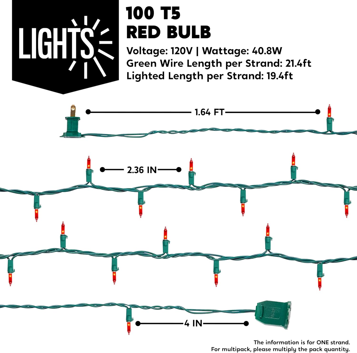 - Super Value Pack. Our Halloween incandescent string lights have a total of 200 incandescent red T5 bulbs with green wire, 100 Incandescent each. 40.8W 120V. Total Lighted Length is 43Feet, 19.4 Feet each. Total Wired Length is 42.8 Feet, 21.4 Feet each. Bulb Spacing 2.36 inches. High Voltage.